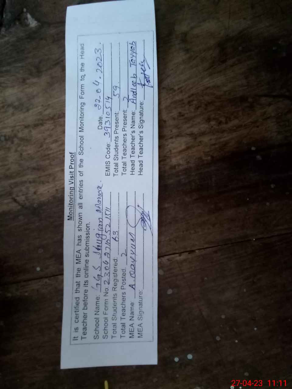 | Attendance Register | Head Teacher | MEA with School | Visit Proof |