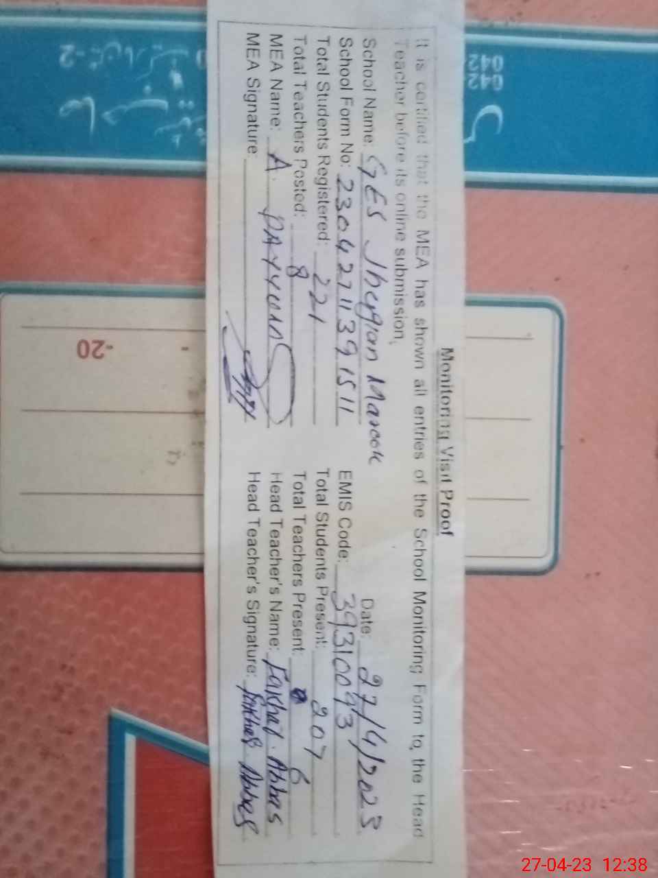 | Attendance Register | Head Teacher | MEA with School | Visit Proof |