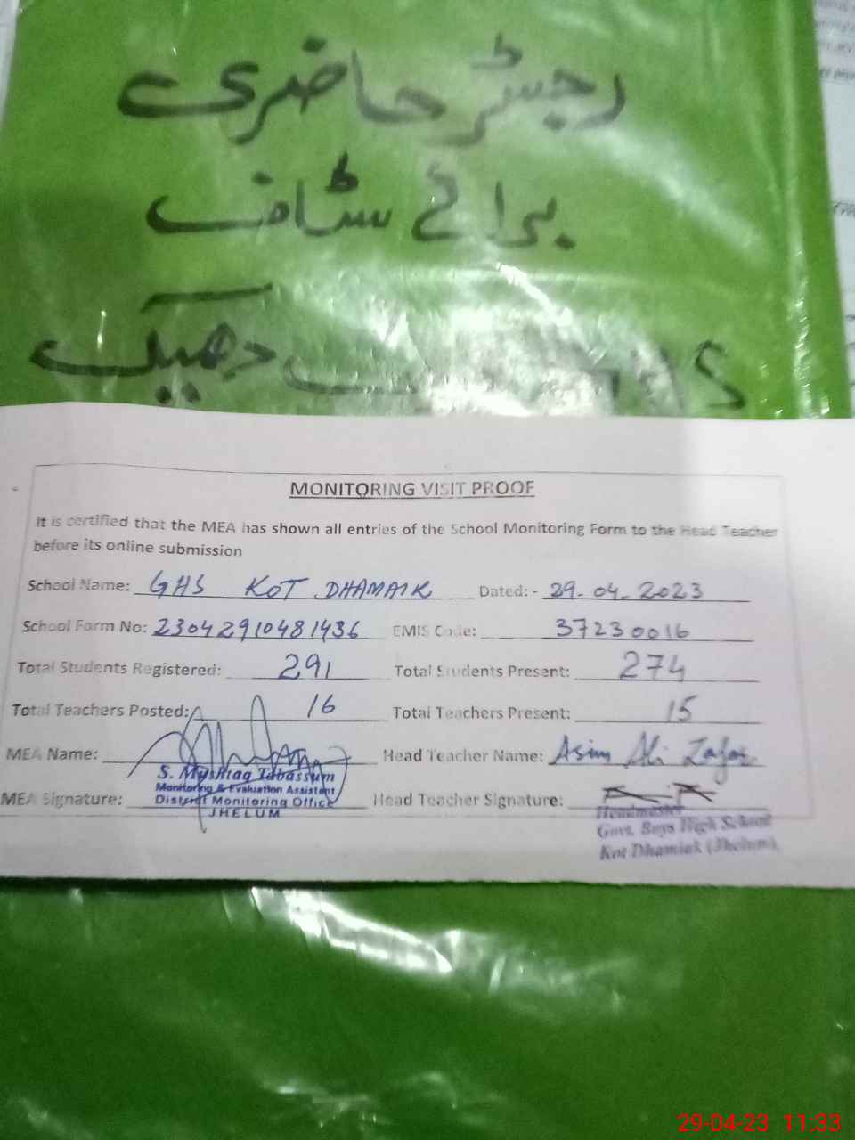| EMIS Code: 37230016 | Name of School: GHS KOT DHAMIAK | |||