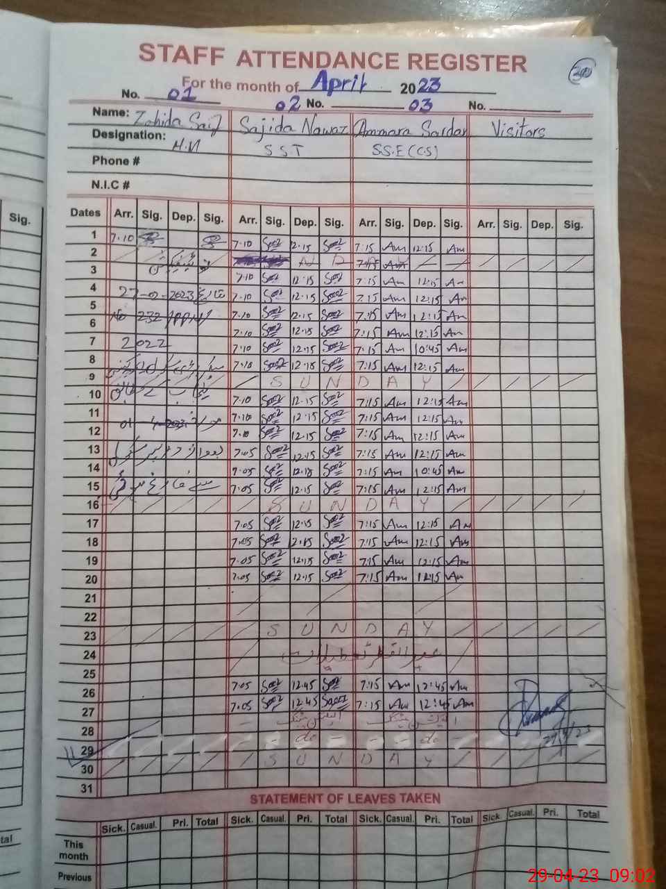 | CNIC | Full Name | Designation | R/C | Absence During Last Calender Month |