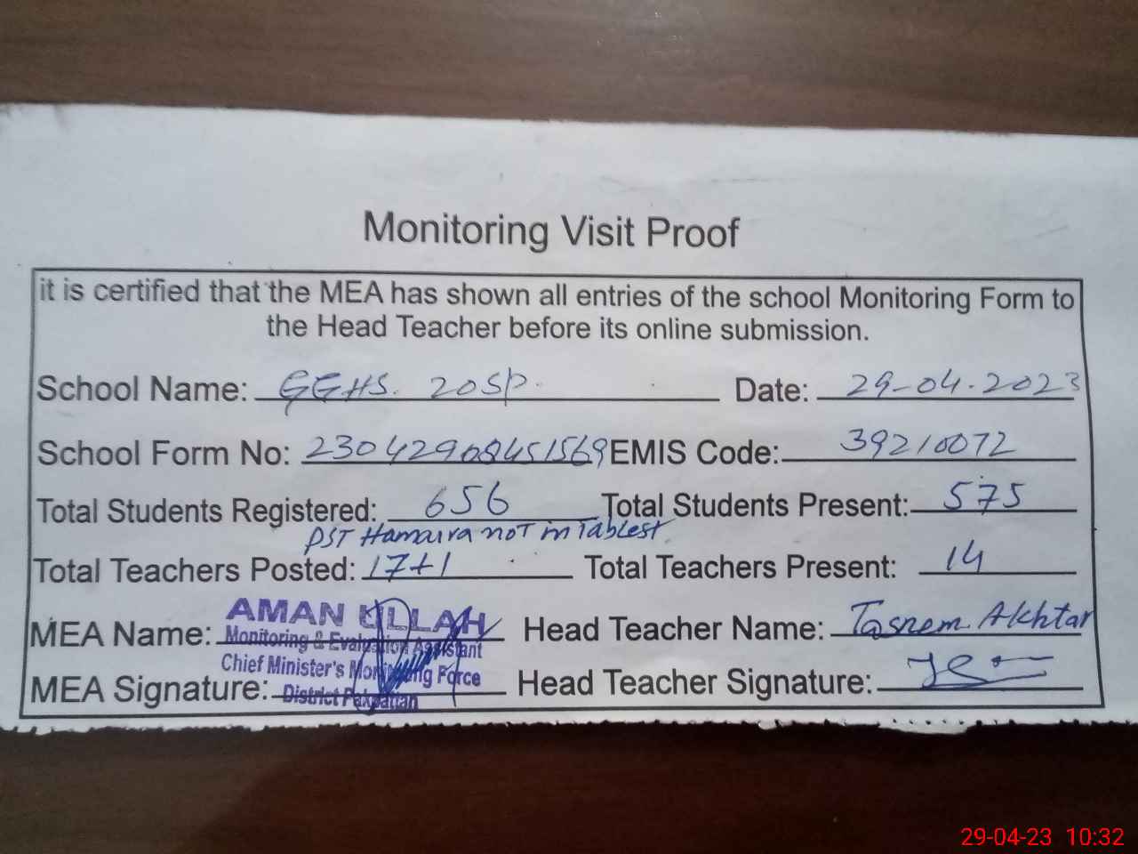 | Monitoring Date: 29-04-2023 | Start Time: 29-04-2023 08:45 AM | End Time: 29-04-2023 10:35 AM | Name of MEA: AM**** UL**** | |