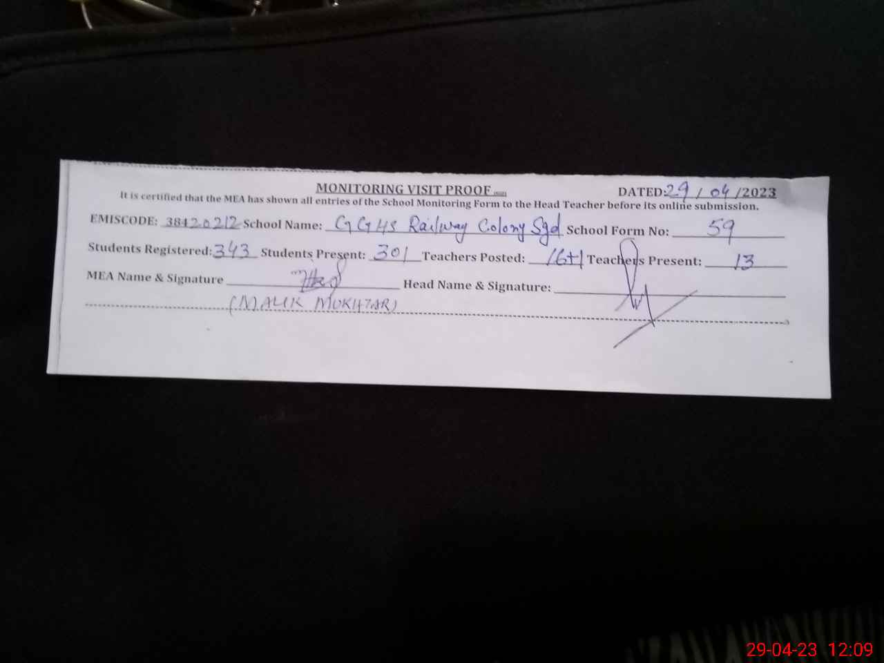 | Attendance Register | Head Teacher | MEA with School | Visit Proof |