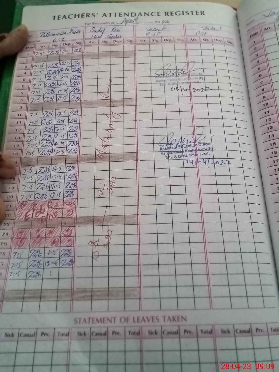 | Name: SA**** RA**** Designation: (School Headmaster's/Headmistress's) PST Phone/Cell Number: 03**** |
