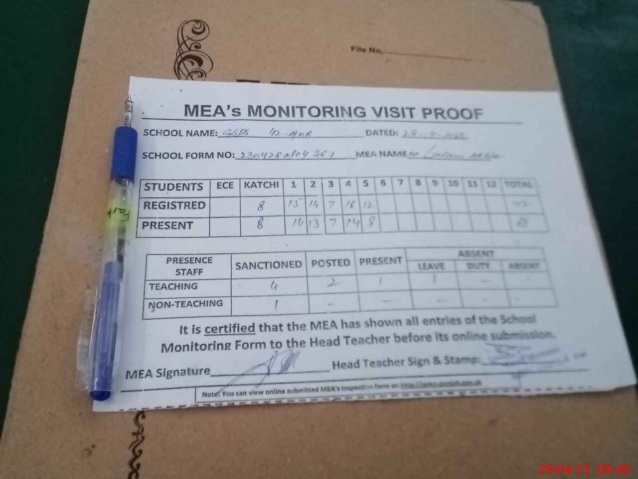 | Attendance Register | Head Teacher | MEA with School | Visit Proof |
