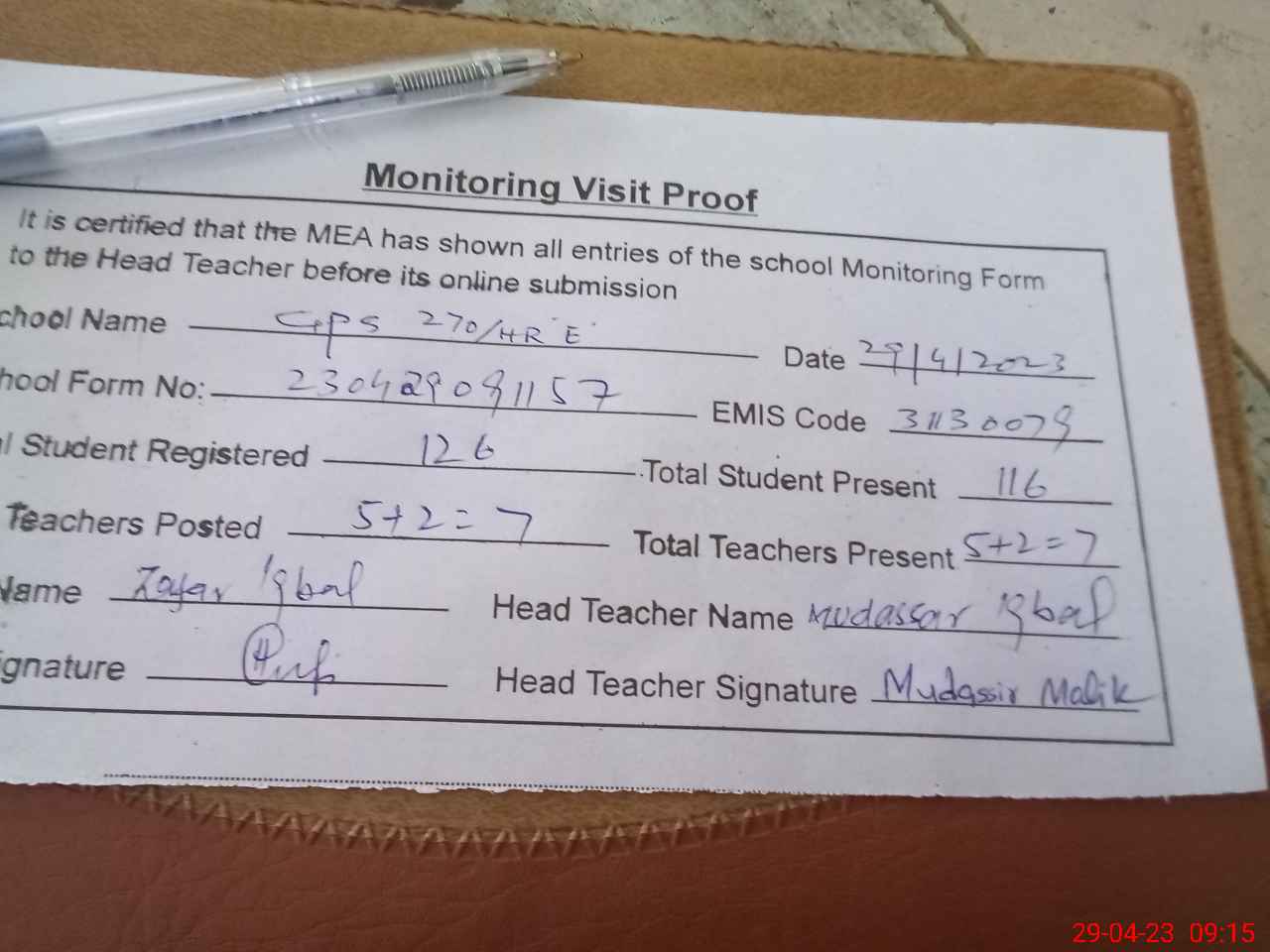 | Attendance Register | Head Teacher | MEA with School | Visit Proof |