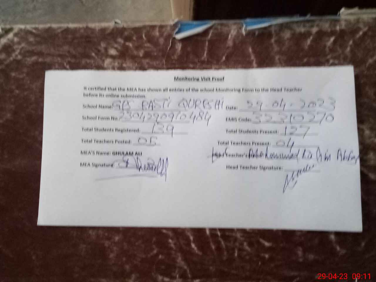 | Attendance Register | Head Teacher | MEA with School | Visit Proof |