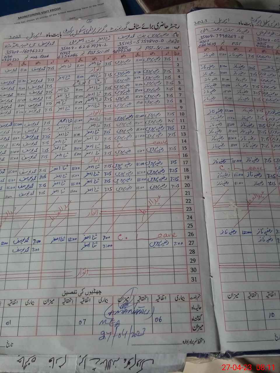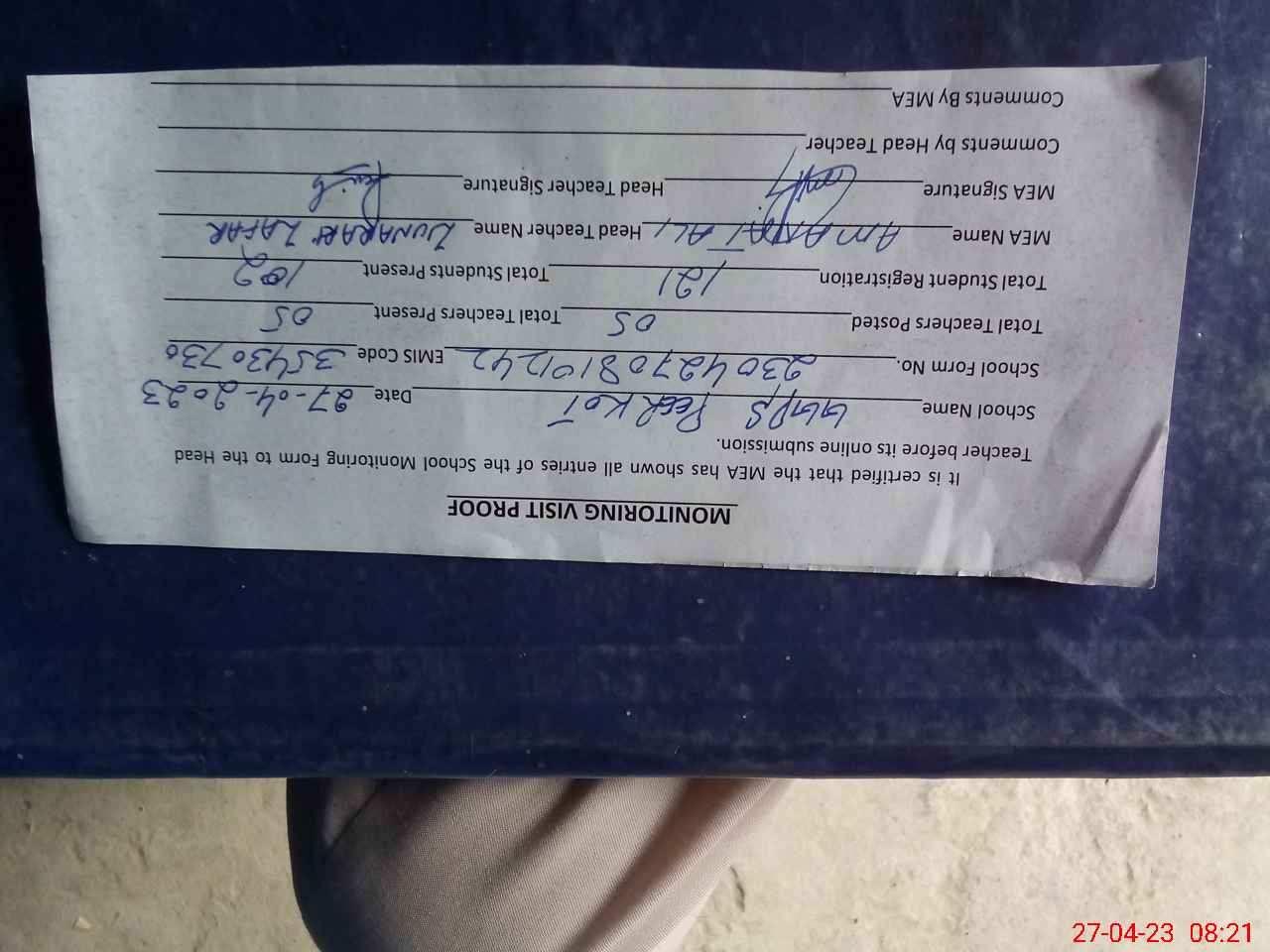 | Attendance Register | Head Teacher | MEA with School | Visit Proof |
