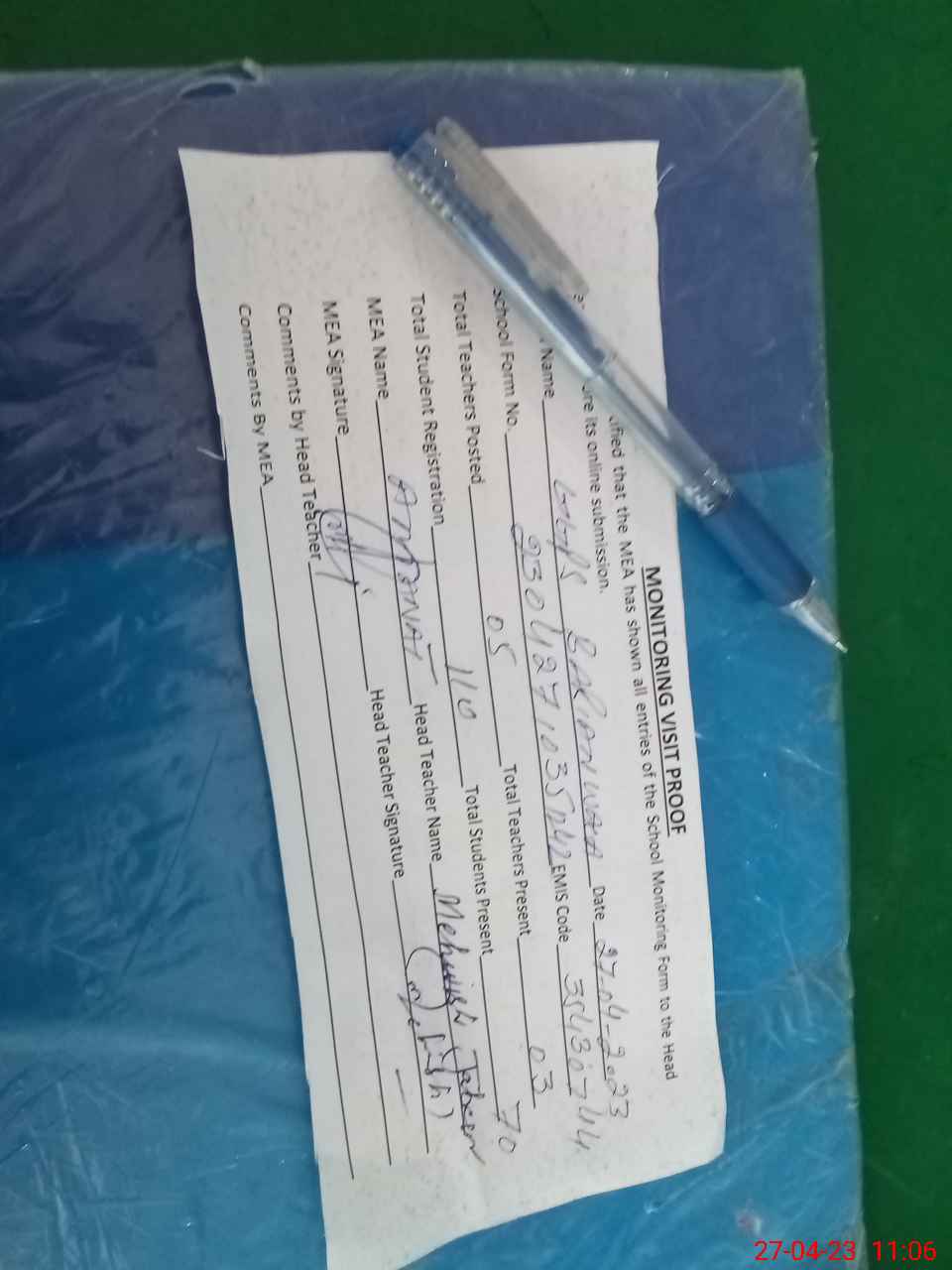 | Attendance Register | Head Teacher | MEA with School | Visit Proof |