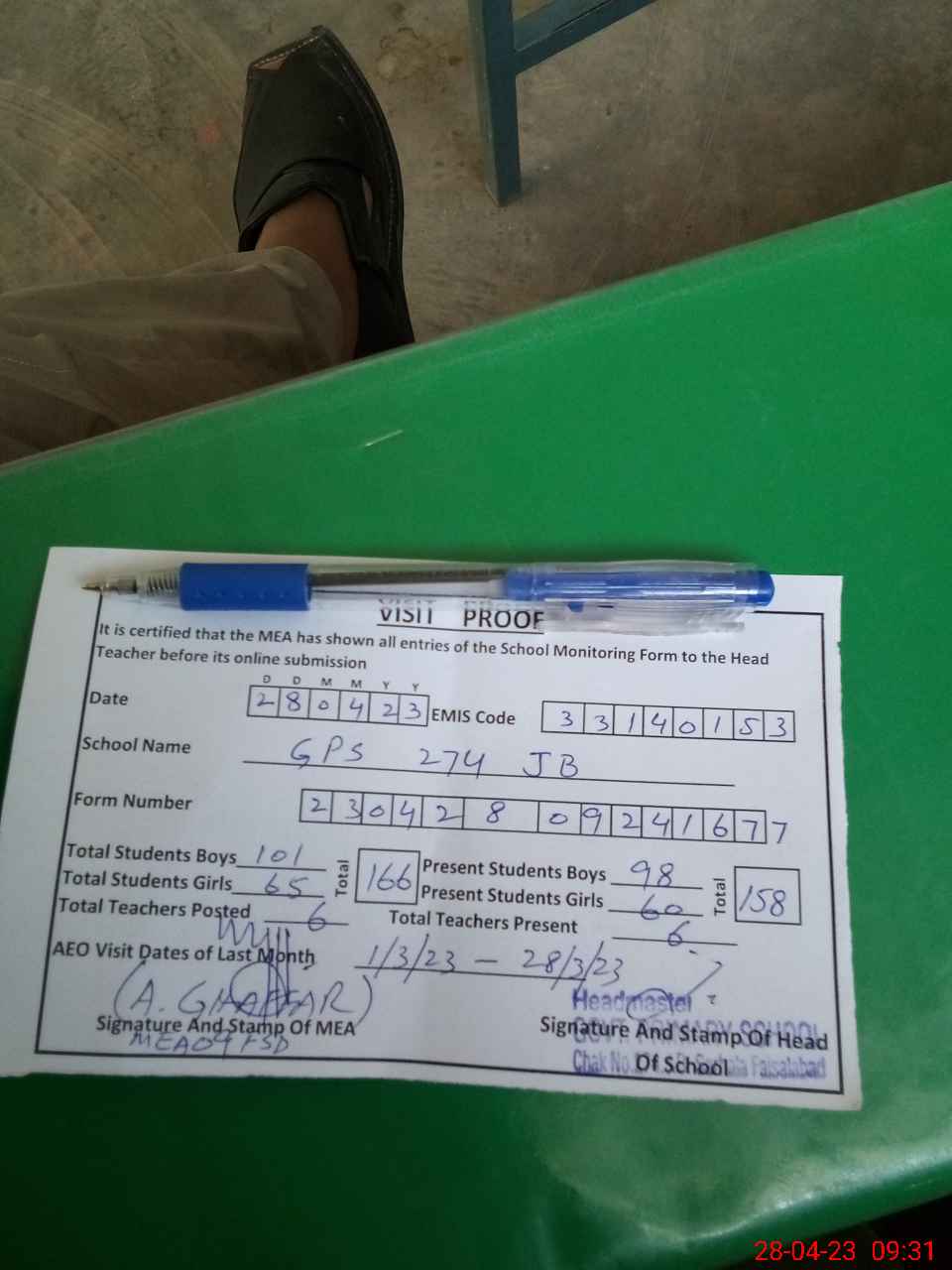 | Attendance Register | Head Teacher | MEA with School | Visit Proof |