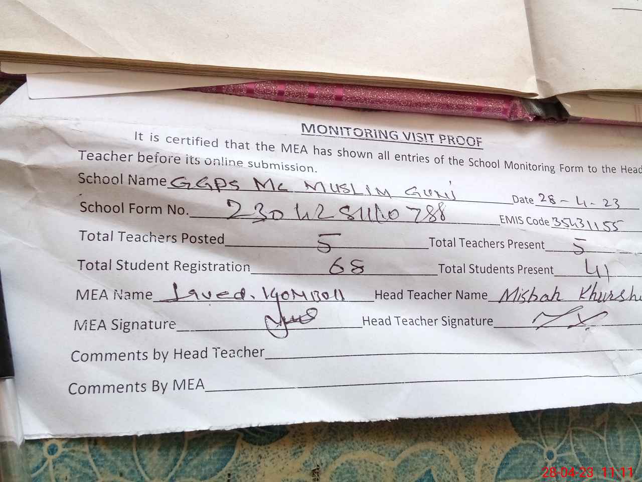 | Attendance Register | Head Teacher | MEA with School | Visit Proof |