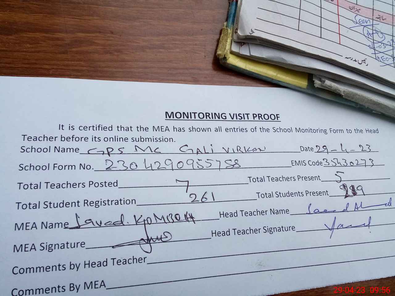 | Attendance Register | Head Teacher | MEA with School | Visit Proof |