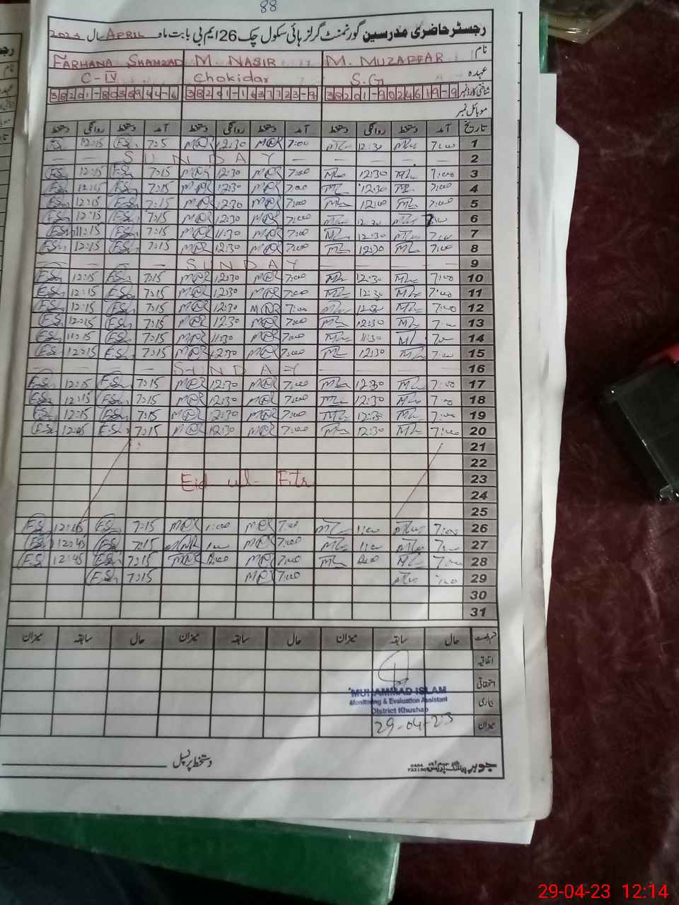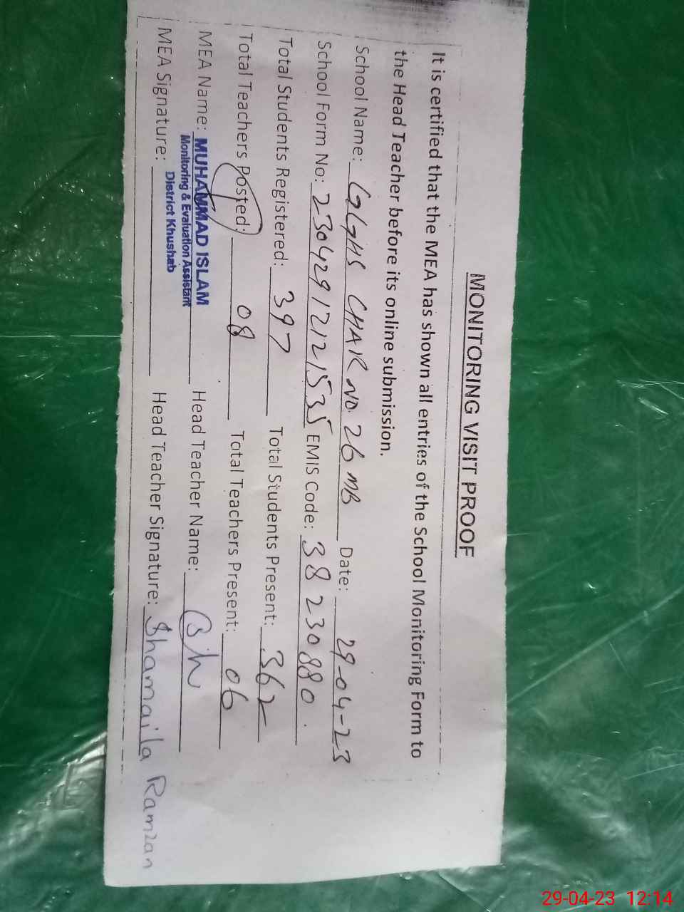 | EMIS Code: 38230880 | Name of School: GGHS CHAK NO 26 MB | |||