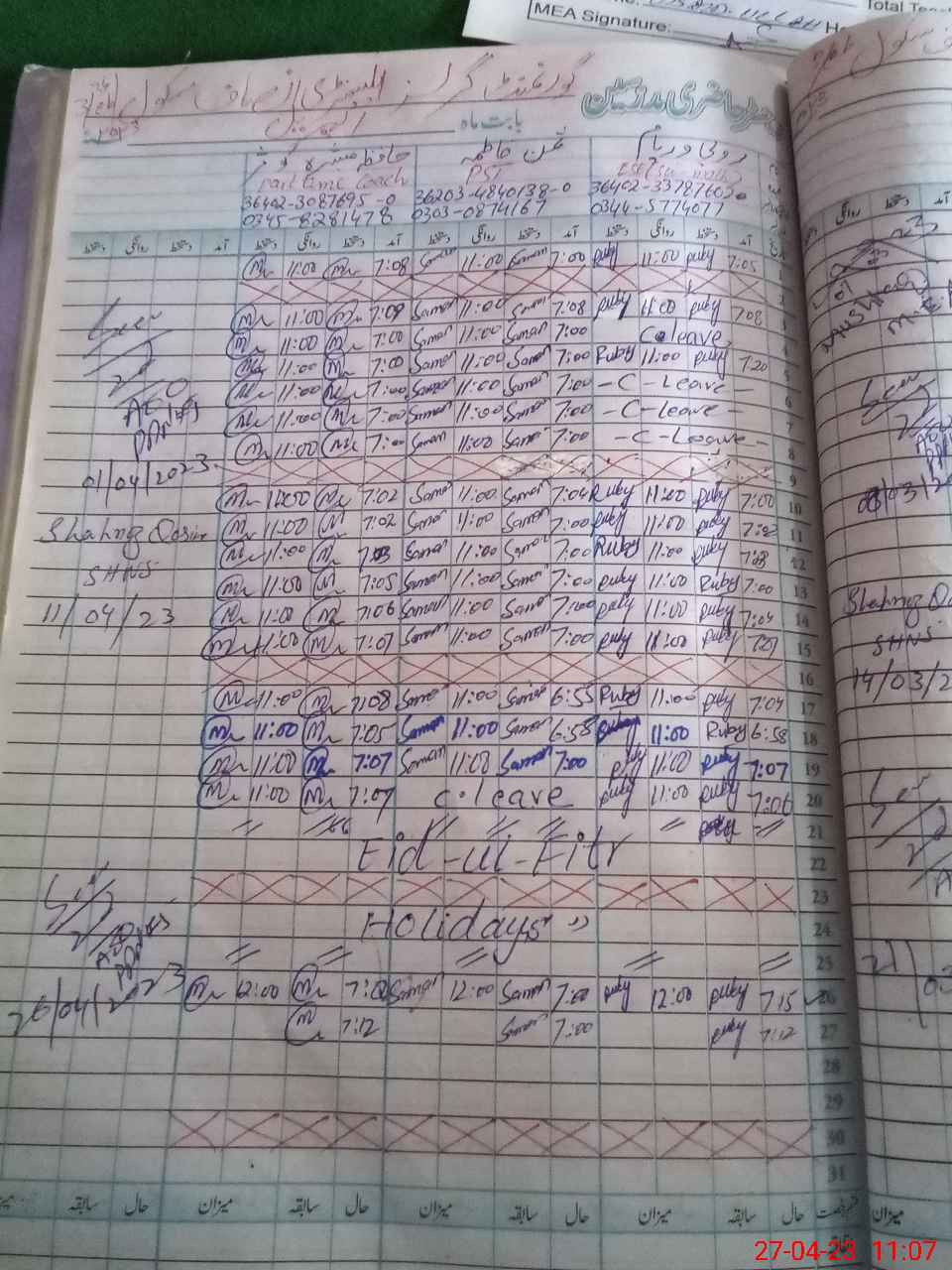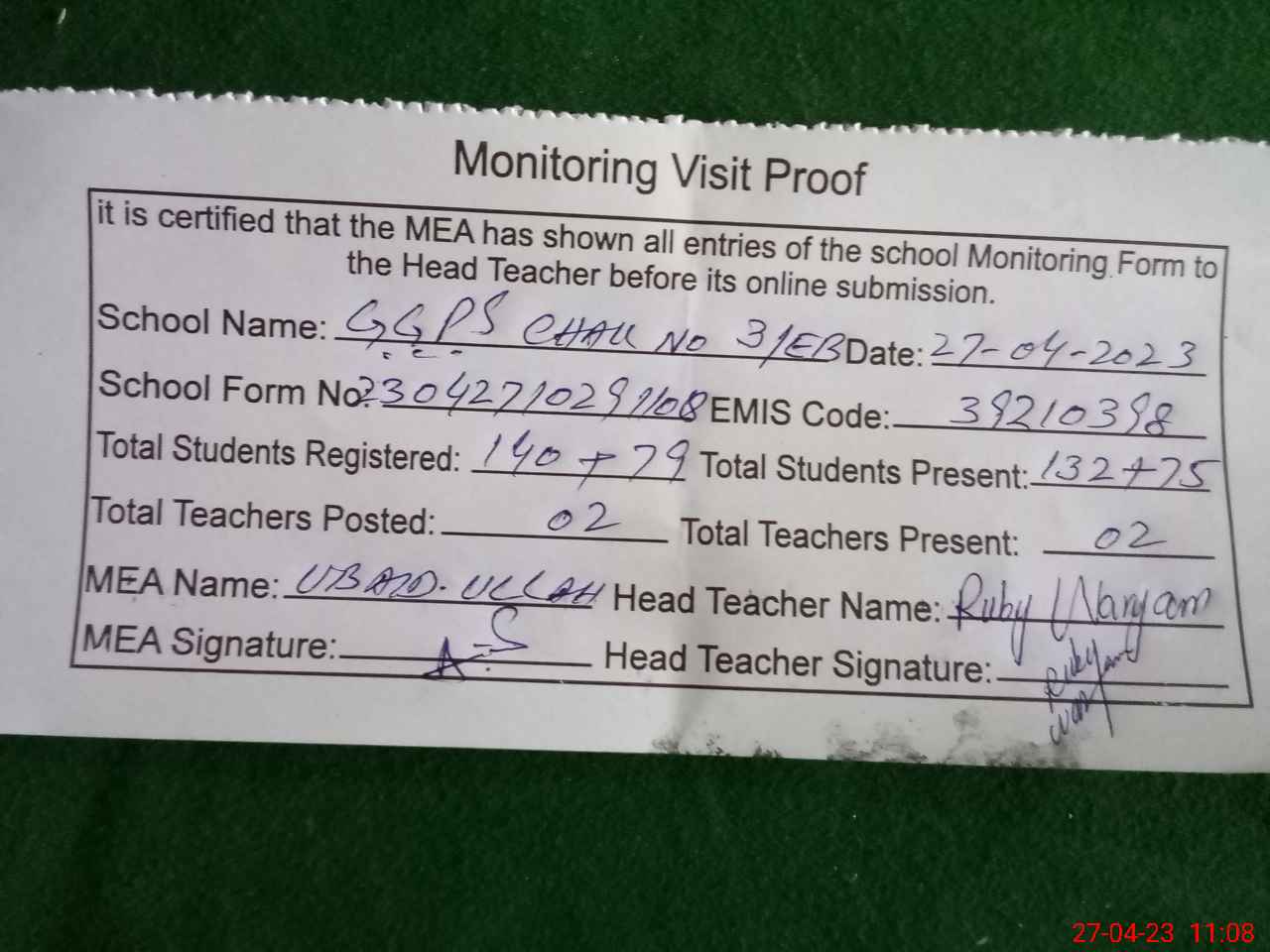| Attendance Register | Head Teacher | MEA with School | Visit Proof |
