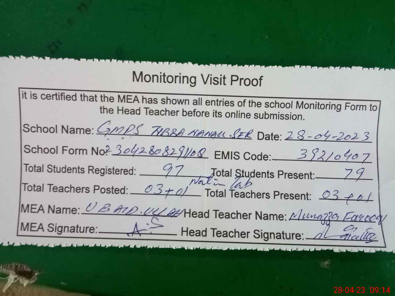 | Attendance Register | Head Teacher | MEA with School | Visit Proof |