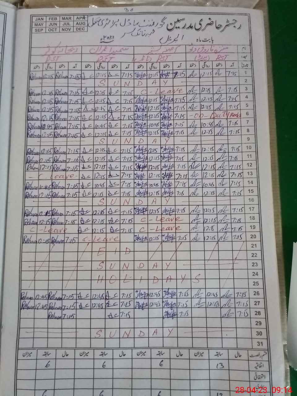 | CNIC | Full Name | Designation | R/C | Absence During Last Calender Month |