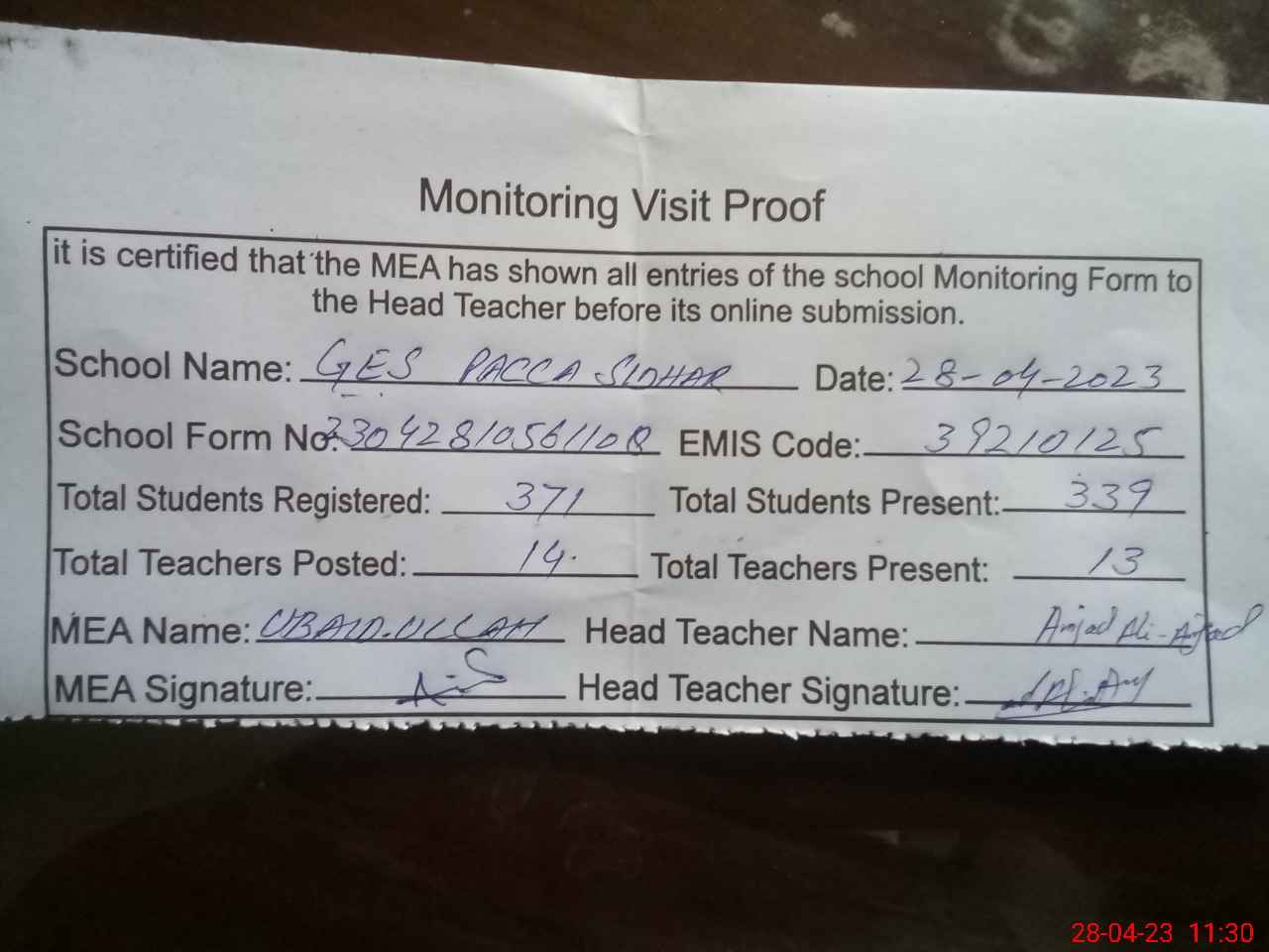 | Attendance Register | Head Teacher | MEA with School | Visit Proof |