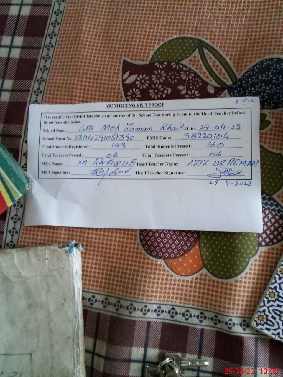 | Attendance Register | Head Teacher | MEA with School | Visit Proof |