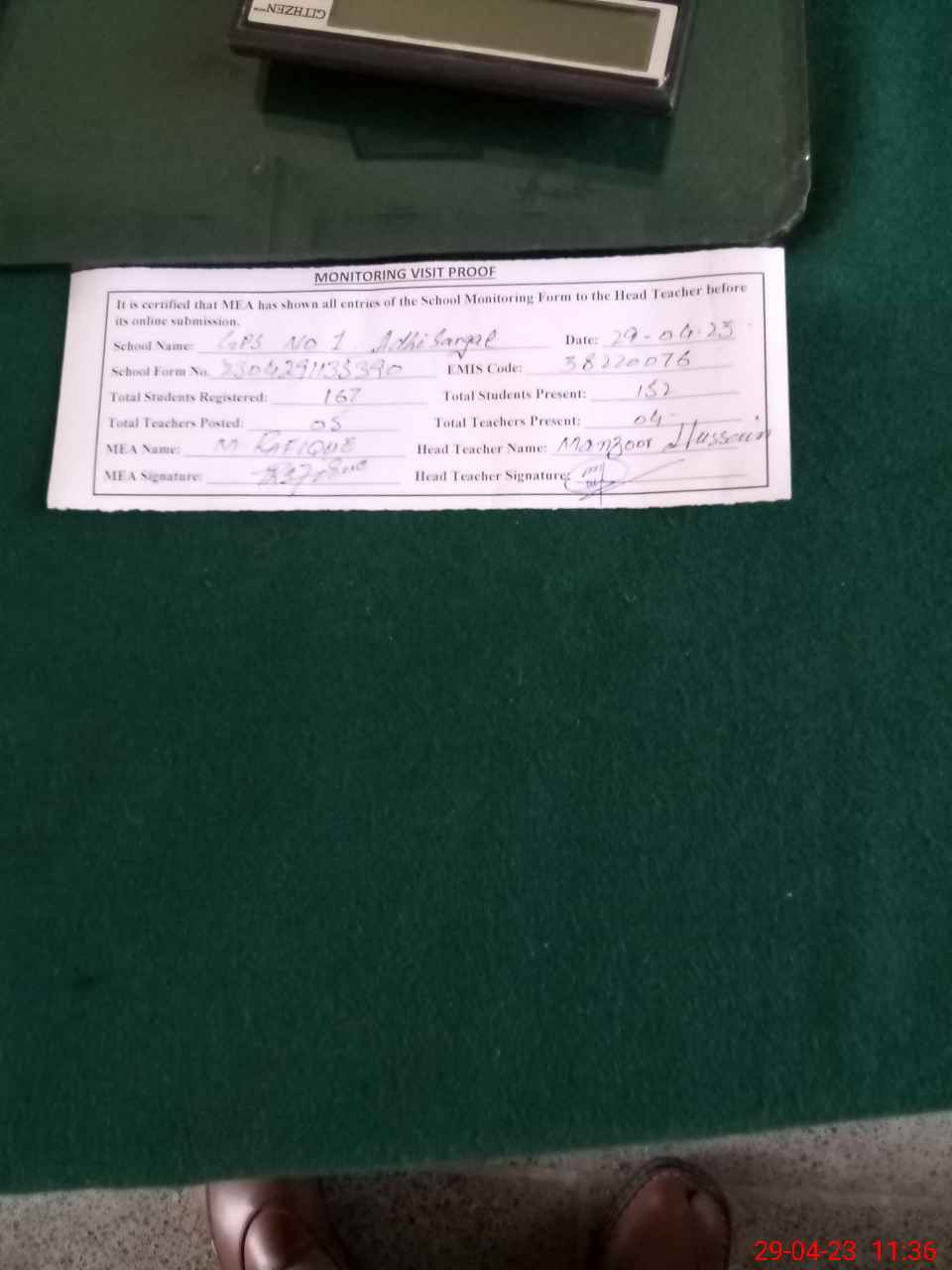 | Attendance Register | Head Teacher | MEA with School | Visit Proof |