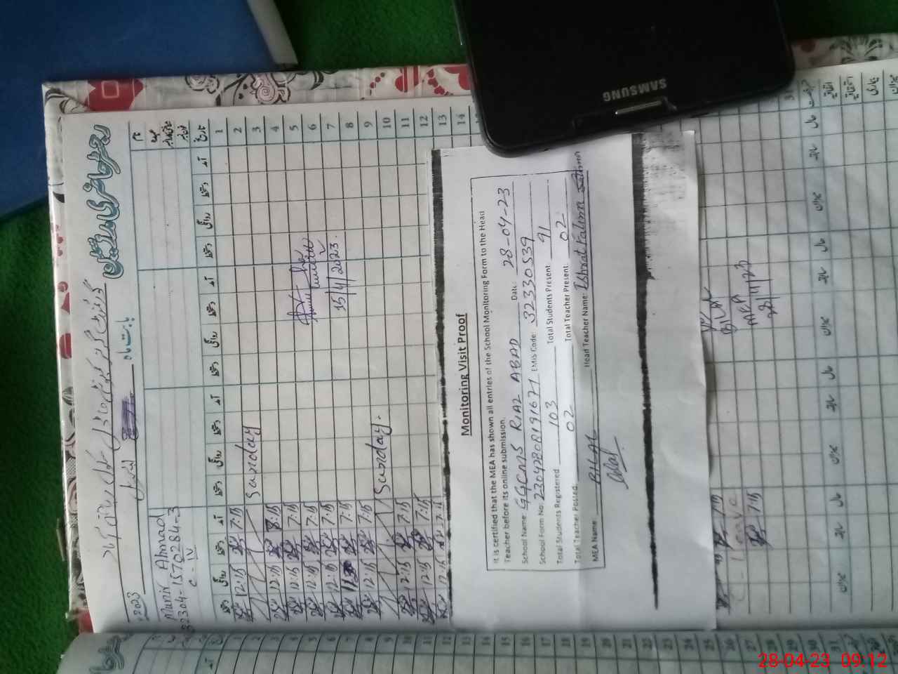 | Attendance Register | Head Teacher | MEA with School | Visit Proof |