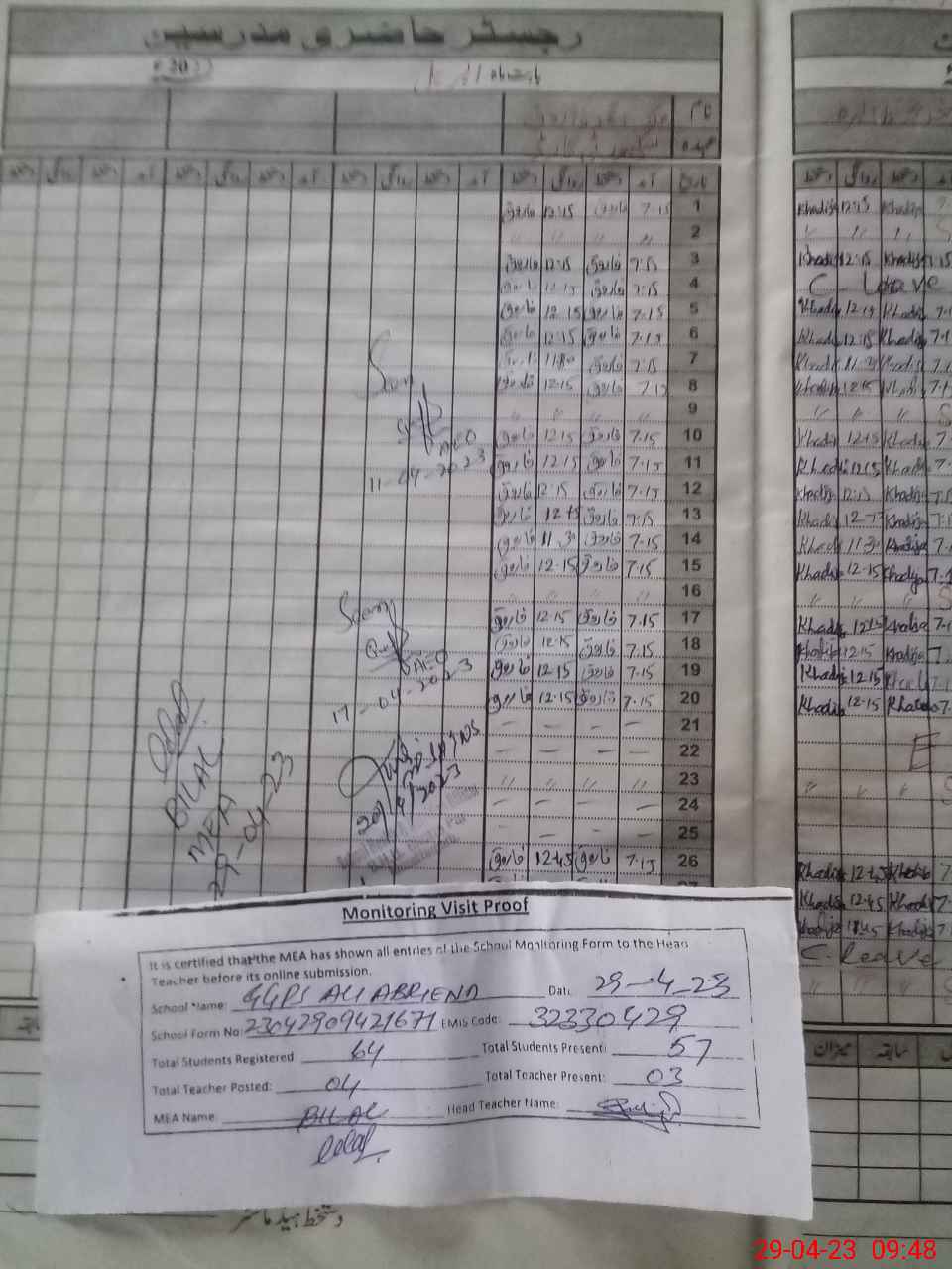| Attendance Register | Head Teacher | MEA with School | Visit Proof |
