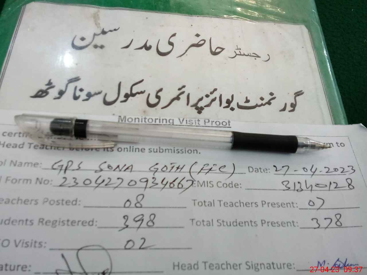 | Attendance Register | Head Teacher | MEA with School | Visit Proof |