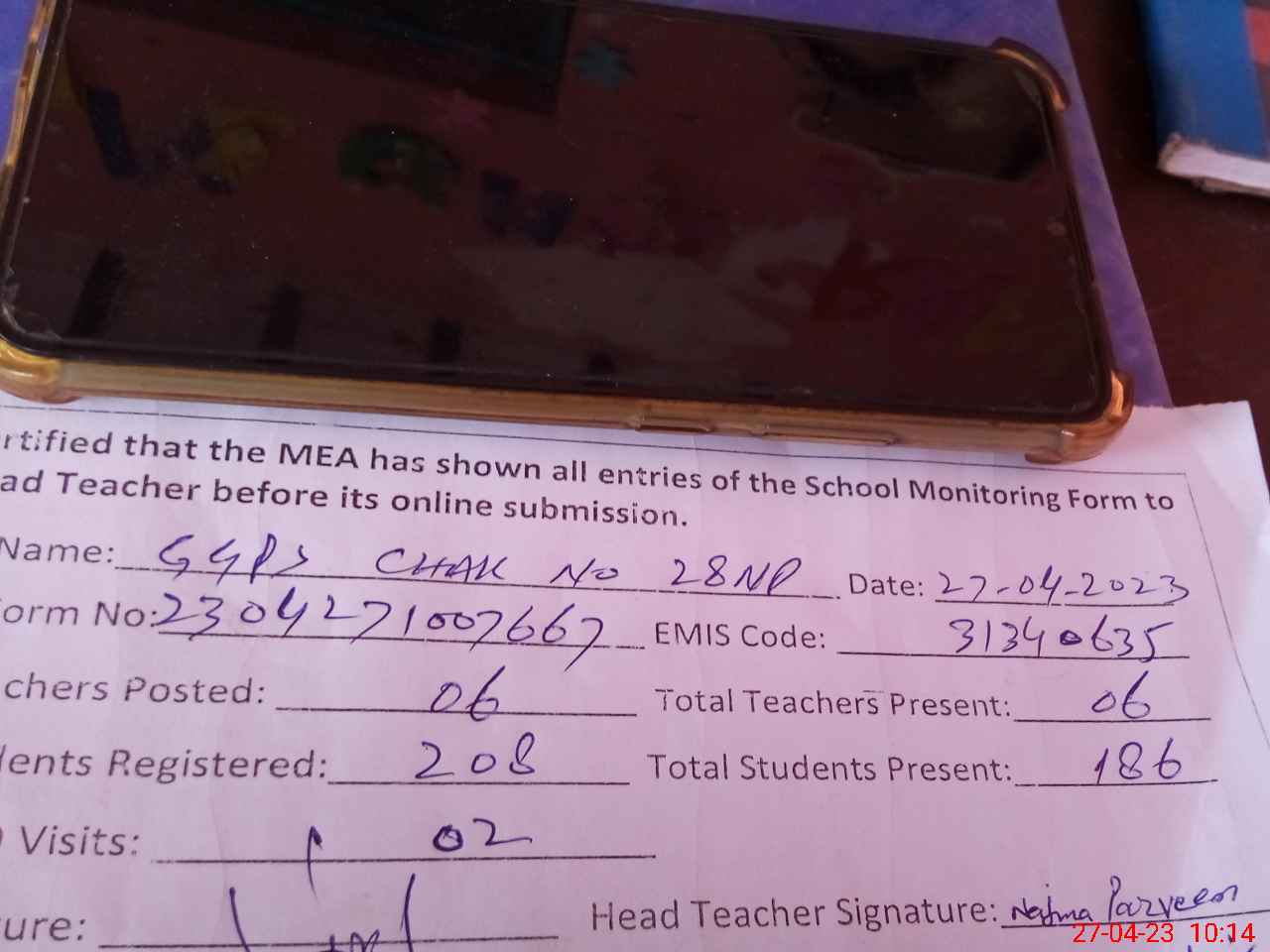 | Attendance Register | Head Teacher | MEA with School | Visit Proof |