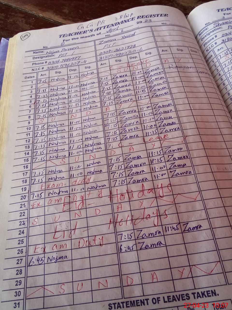 | CNIC | Full Name | Designation | R/C | Absence During Last Calender Month |