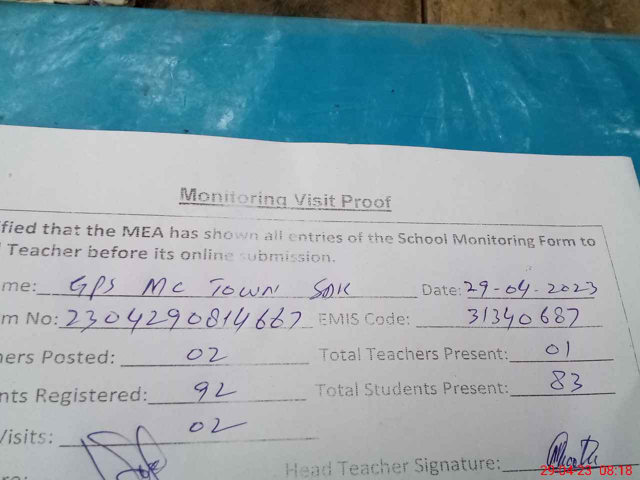 | Attendance Register | Head Teacher | MEA with School | Visit Proof |