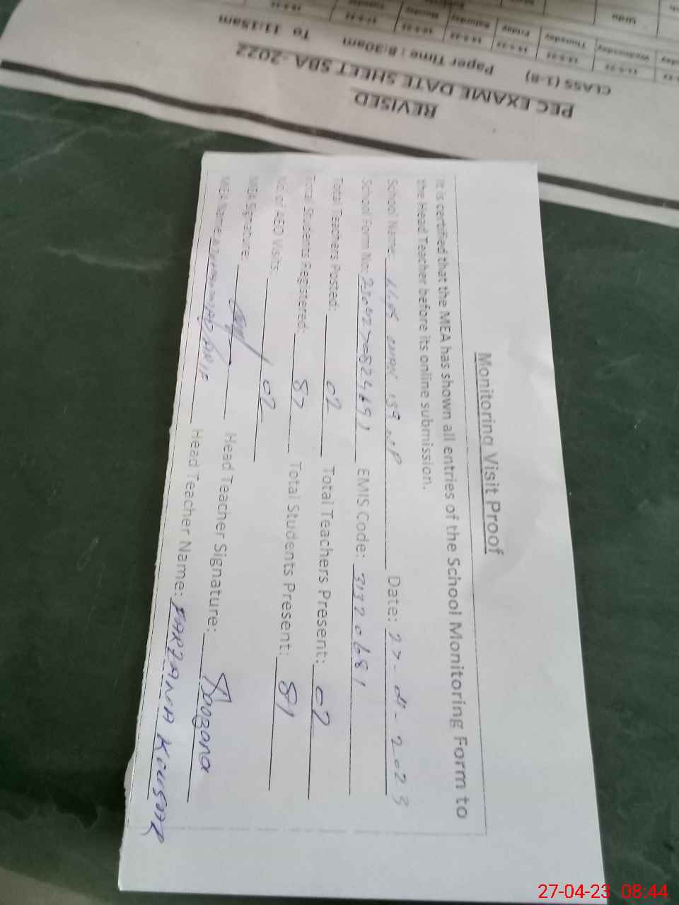 | Attendance Register | Head Teacher | MEA with School | Visit Proof |