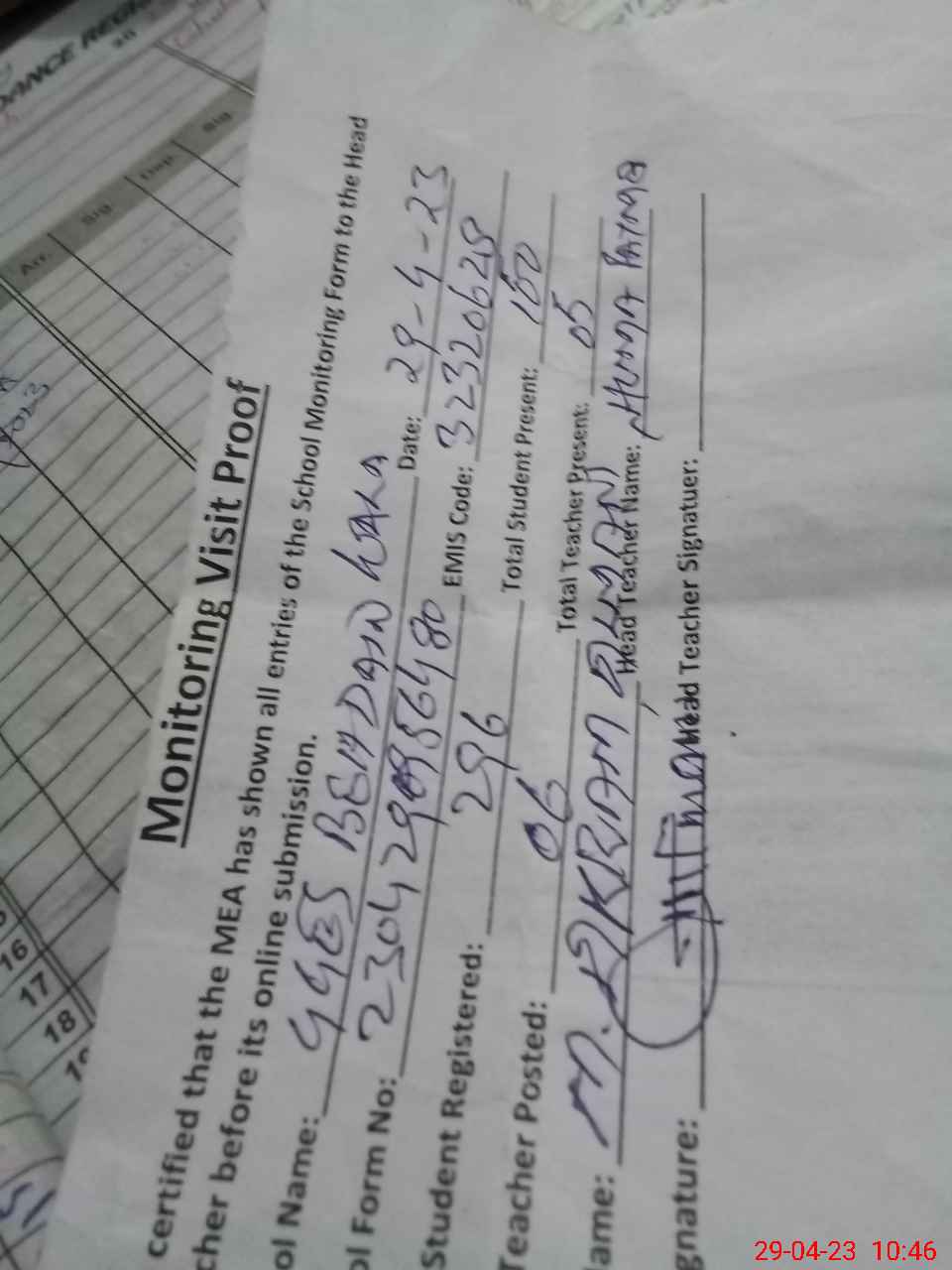 | Attendance Register | Head Teacher | MEA with School | Visit Proof |