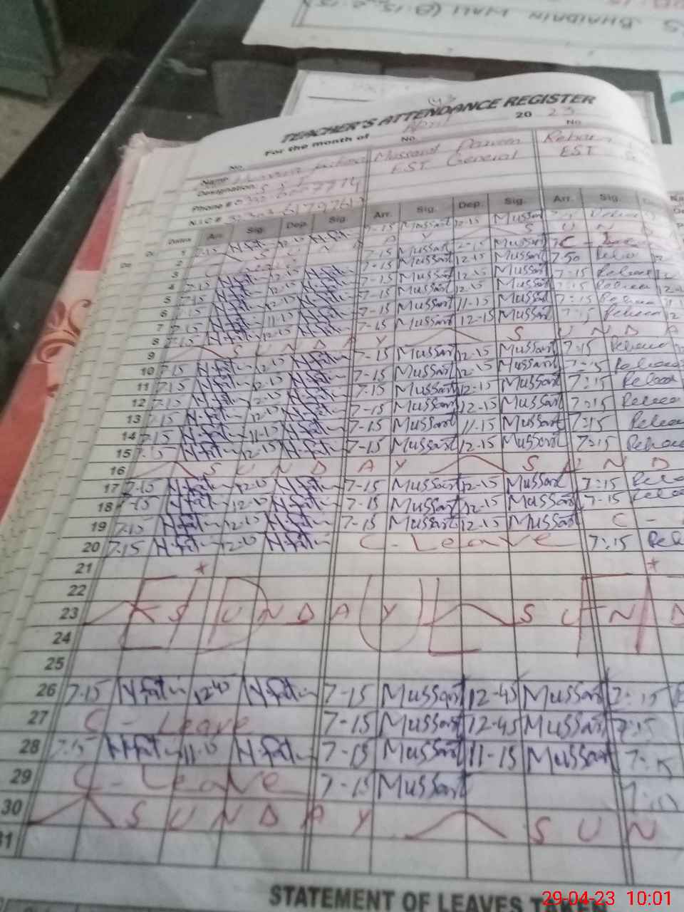| CNIC | Full Name | Designation | R/C | Absence During Last Calender Month |