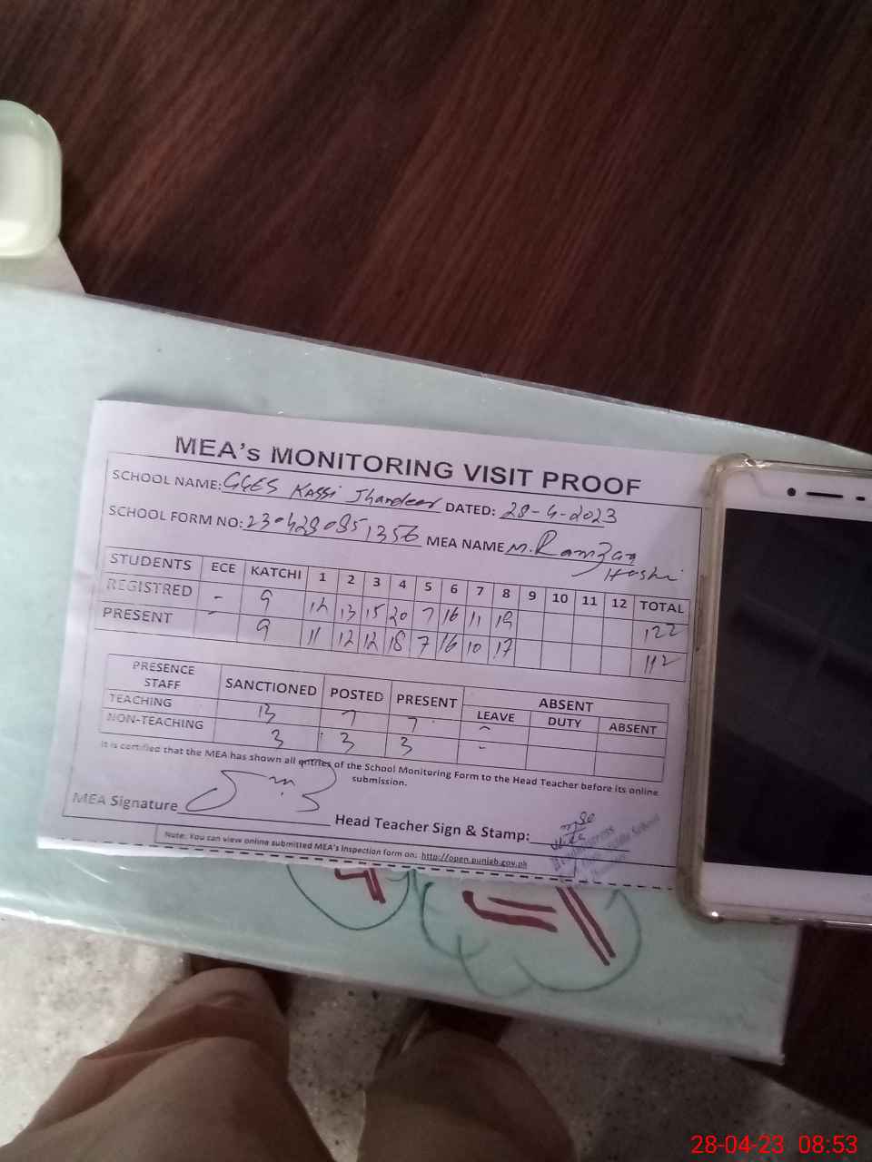 | Attendance Register | Head Teacher | MEA with School | Visit Proof |