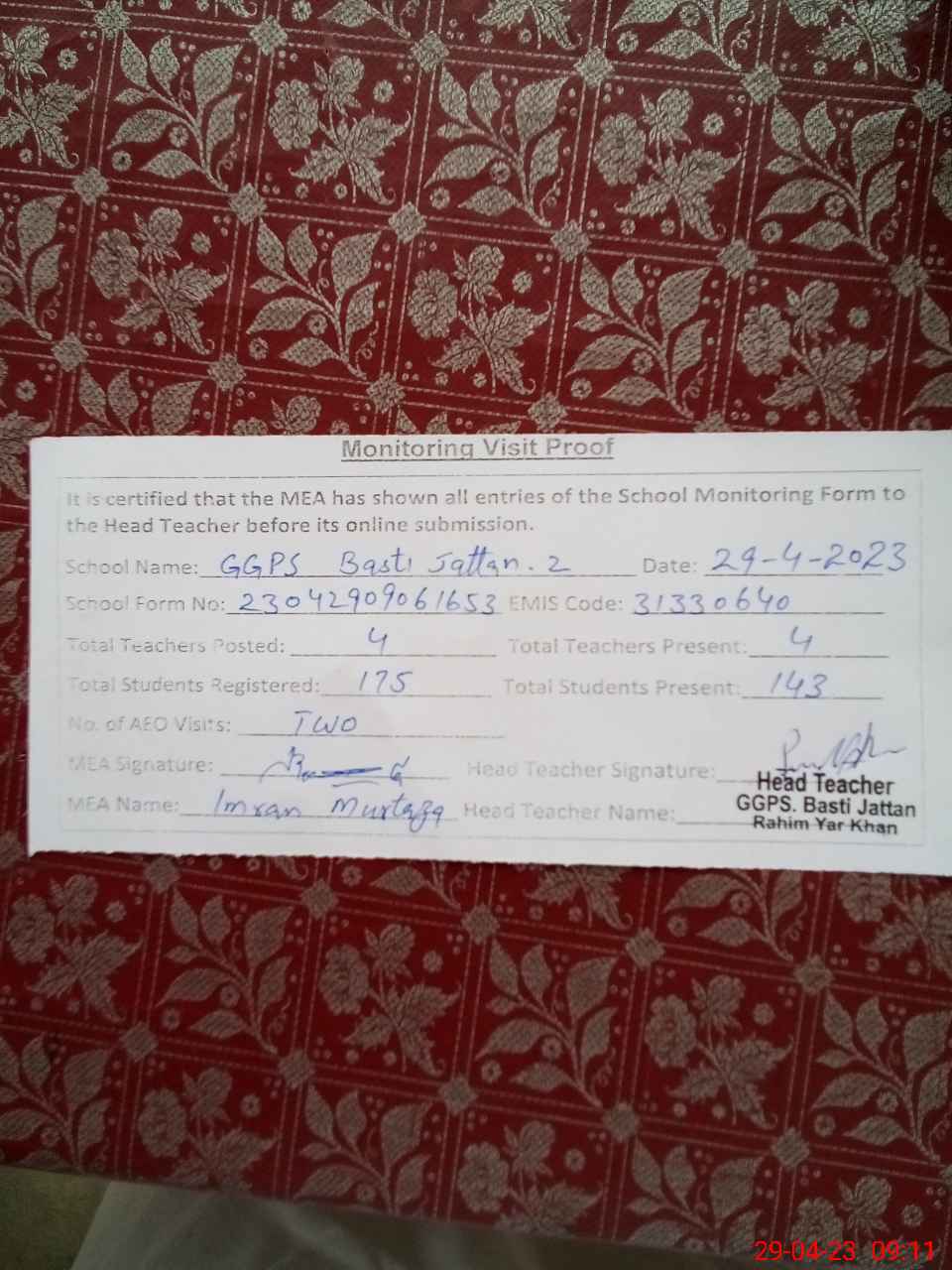 | EMIS Code: 31330640 | Name of School: GGPS BASTI JATTAN R.Y.KHAN (Basti Burra) | |||