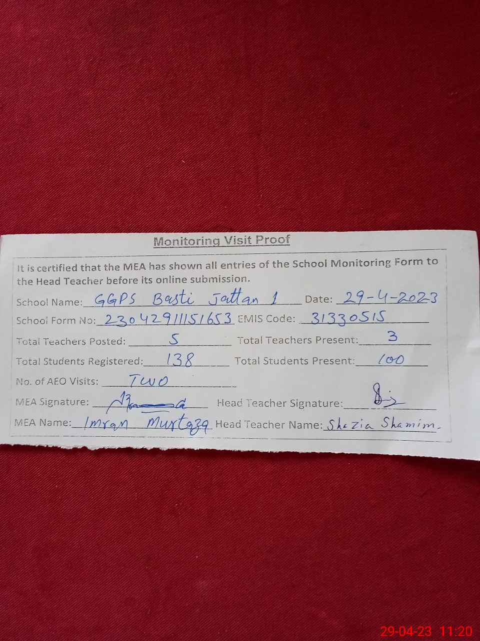 | Attendance Register | Head Teacher | MEA with School | Visit Proof |