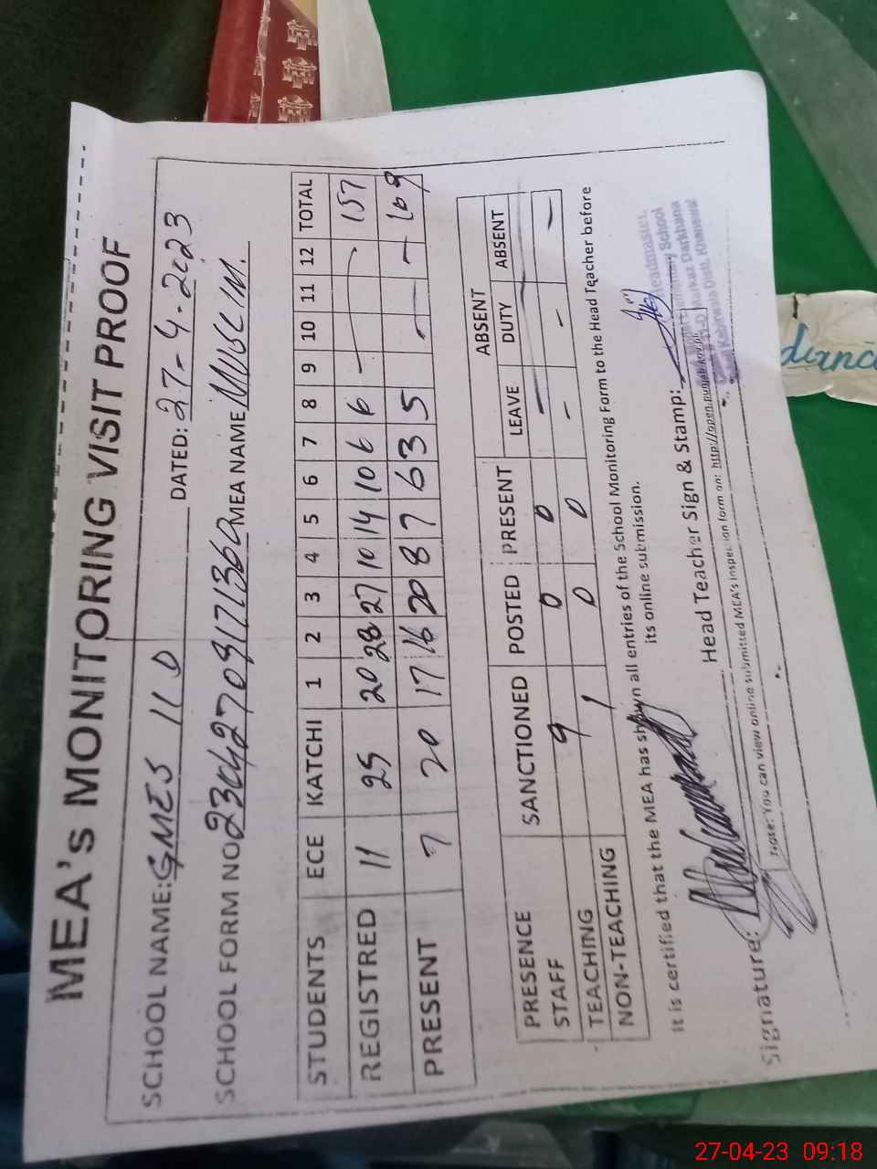 | Attendance Register | Head Teacher | MEA with School | Visit Proof |