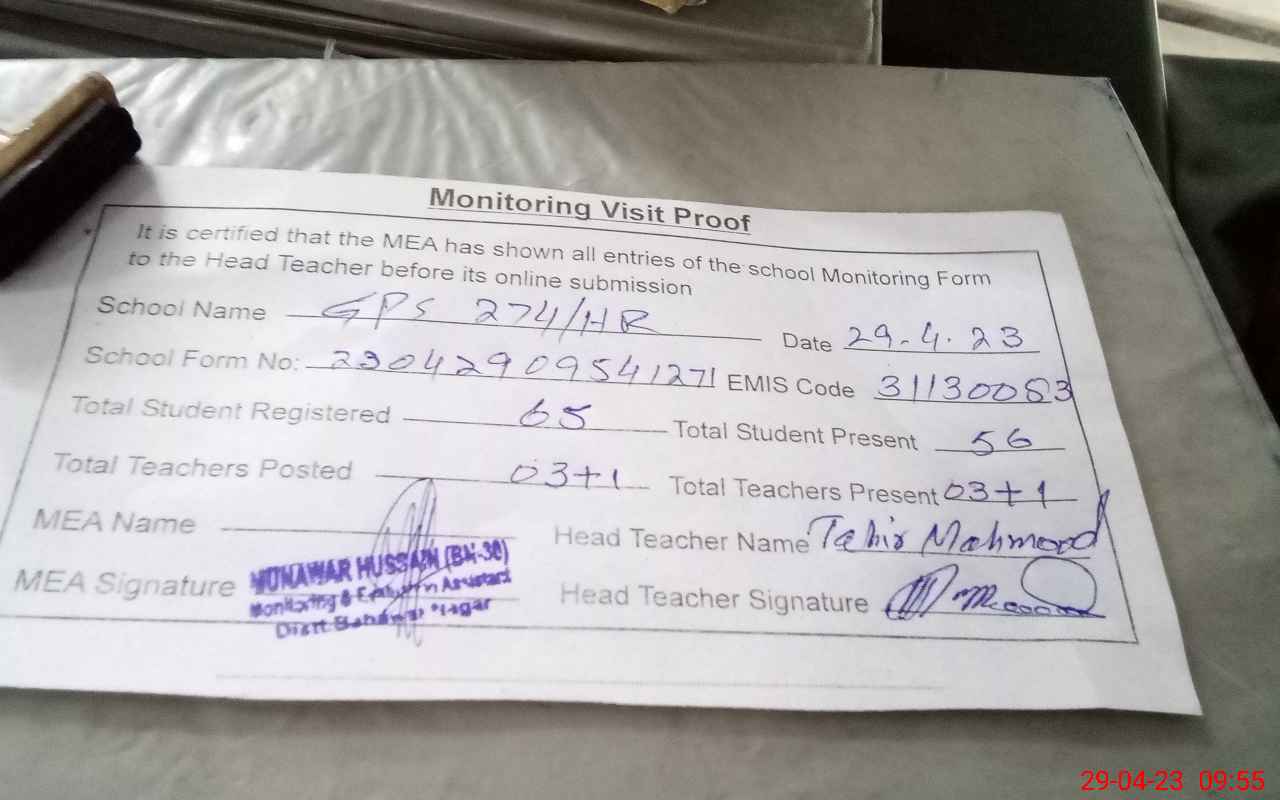 | EMIS Code: 31130083 | Name of School: GPS CHAK NO.274/HR | |||