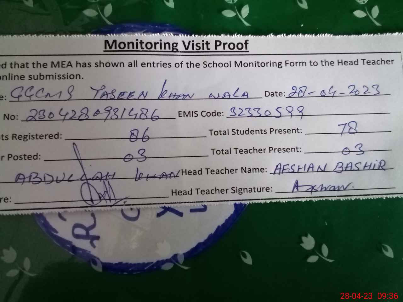 | Attendance Register | Head Teacher | MEA with School | Visit Proof |