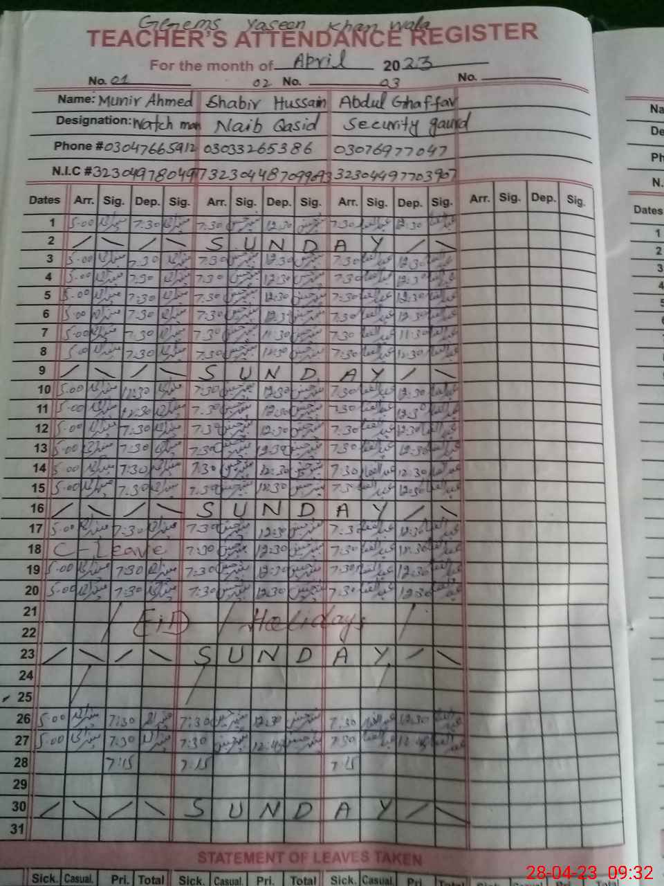 | CNIC | Full Name | Designation | R/C | Absence During Last Calender Month |