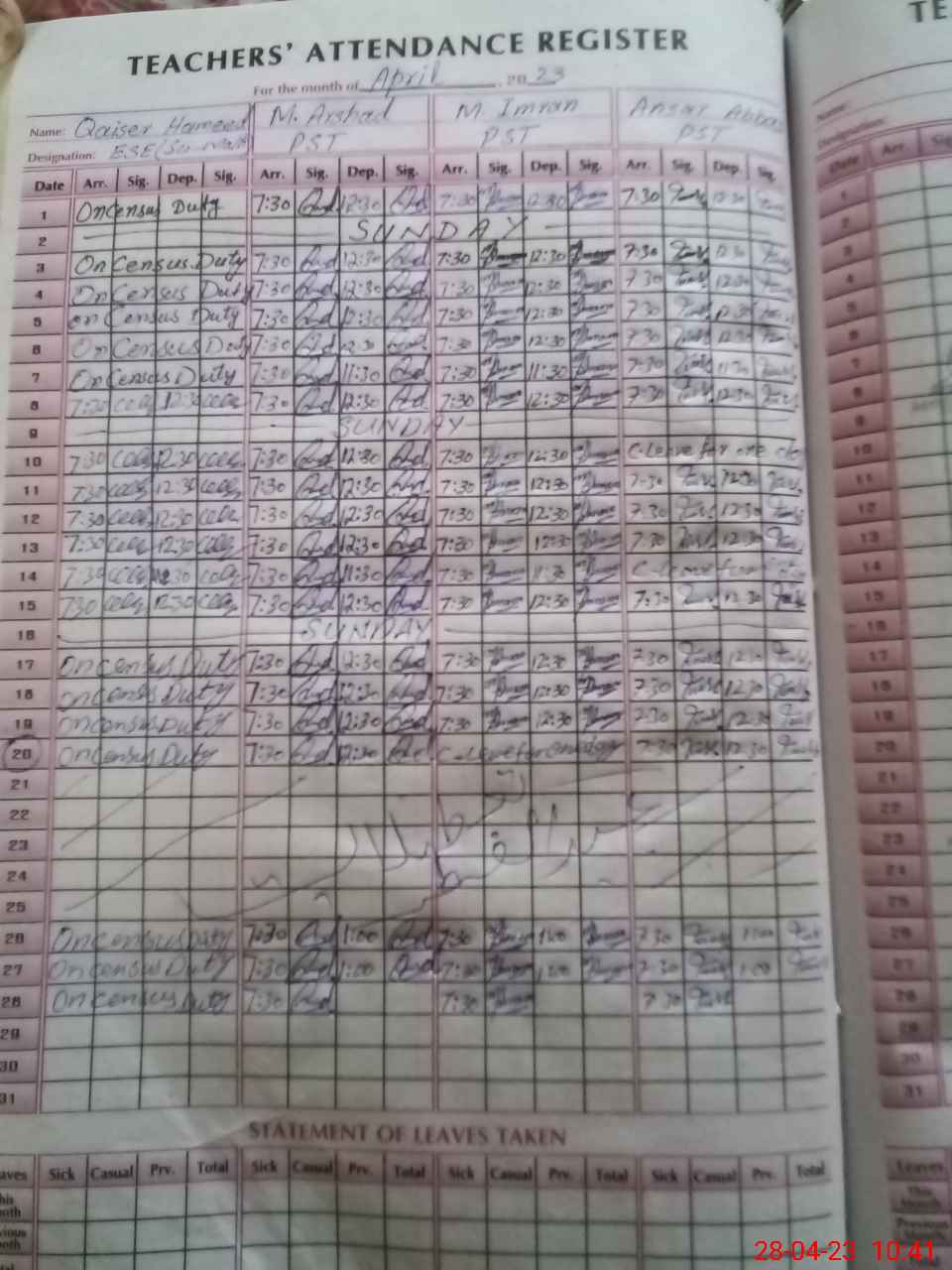 | Leave | Duty | Absent | Maternity | Medical | Ex- Pak |