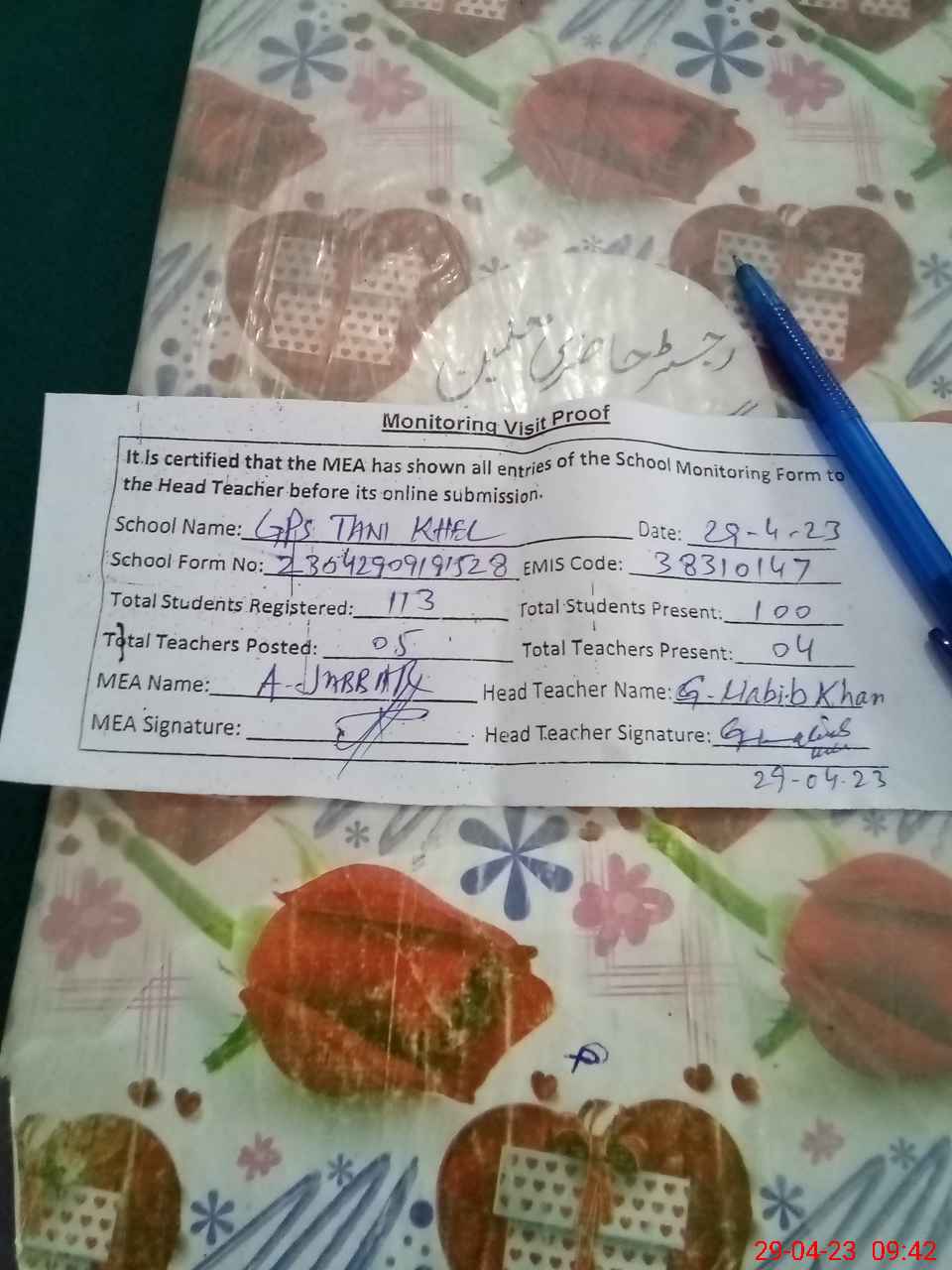 | Attendance Register | Head Teacher | MEA with School | Visit Proof |