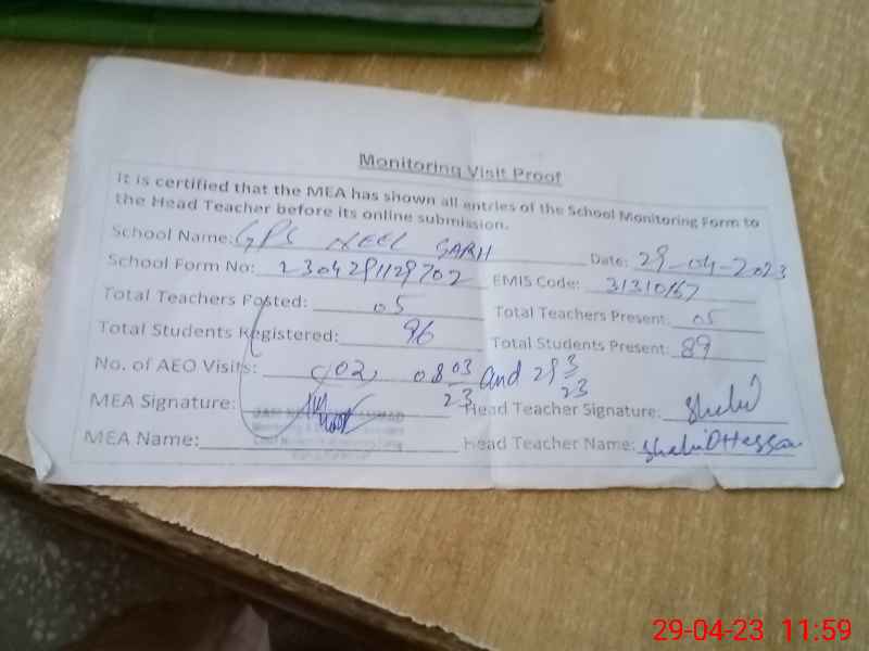 | Attendance Register | Head Teacher | MEA with School | Visit Proof |
