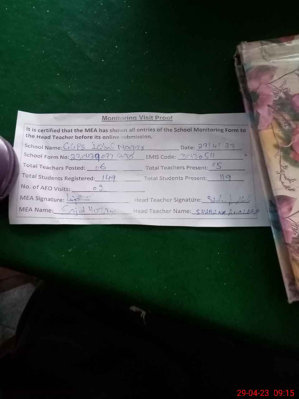 | Attendance Register | Head Teacher | MEA with School | Visit Proof |