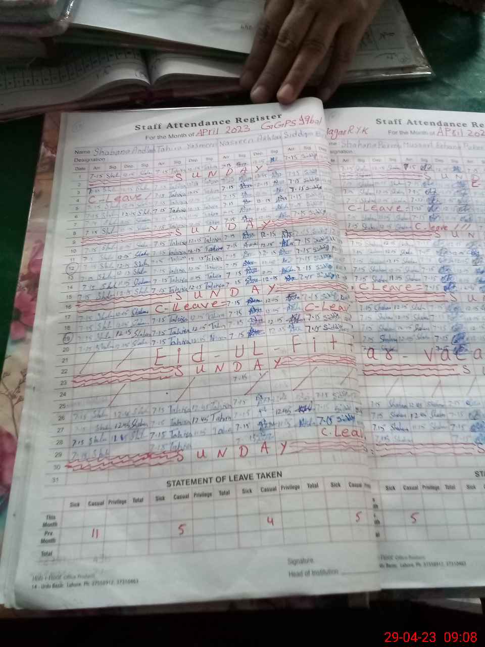 | CNIC | Full Name | Designation | R/C | Absence During Last Calender Month |