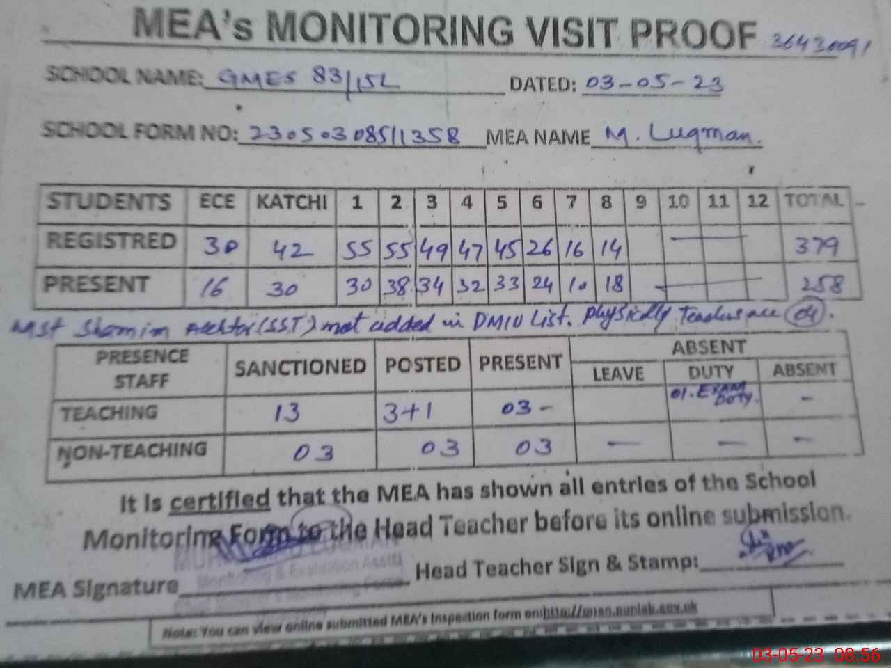 | Certified that this School was Inspected by the Undersigned MEA/DMO Today and the Information Stated Above is as Per Record. | |||||