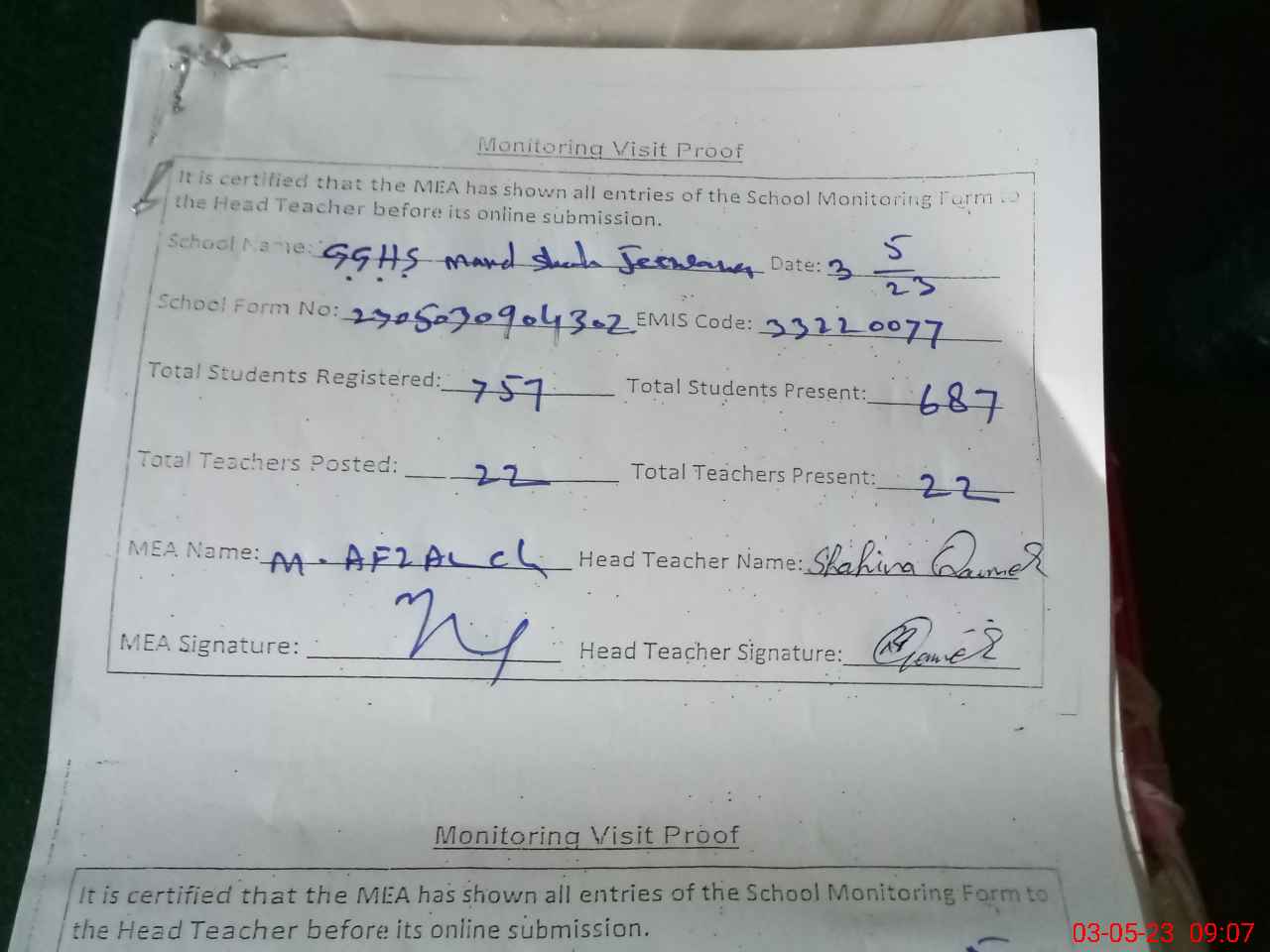 | Attendance Register | Head Teacher | MEA with School | Visit Proof |