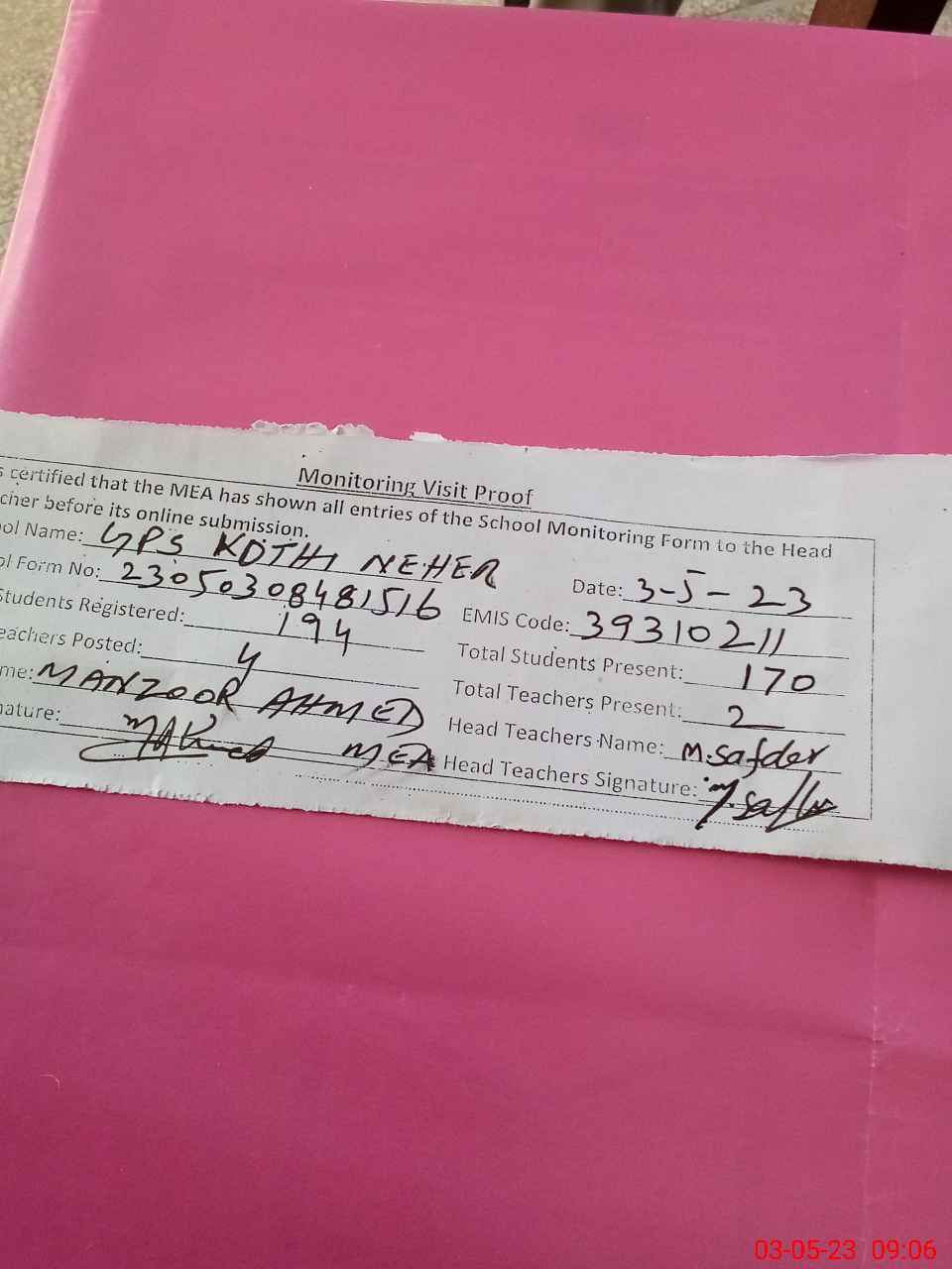 | Attendance Register | Head Teacher | MEA with School | Visit Proof |