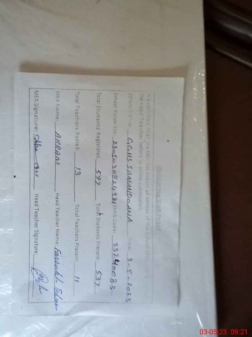 | Attendance Register | Head Teacher | MEA with School | Visit Proof |
