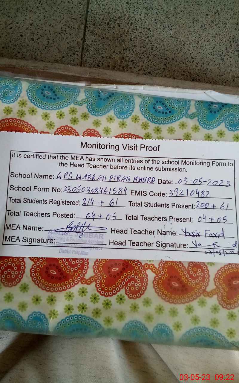 | EMIS Code: 39210482 | Name of School: GPS WARRAH PIRAN KHURD | |||