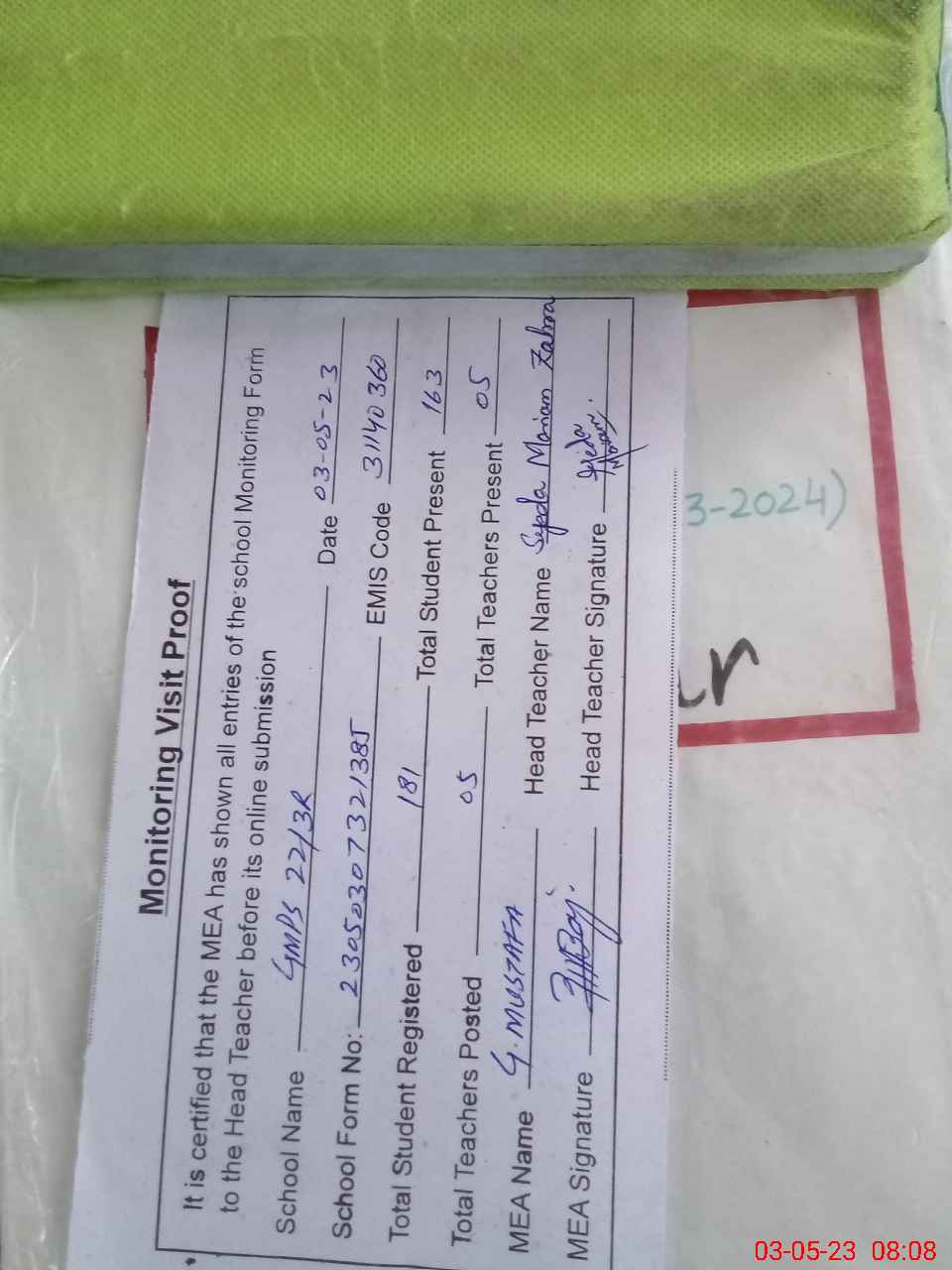 | Attendance Register | Head Teacher | MEA with School | Visit Proof |
