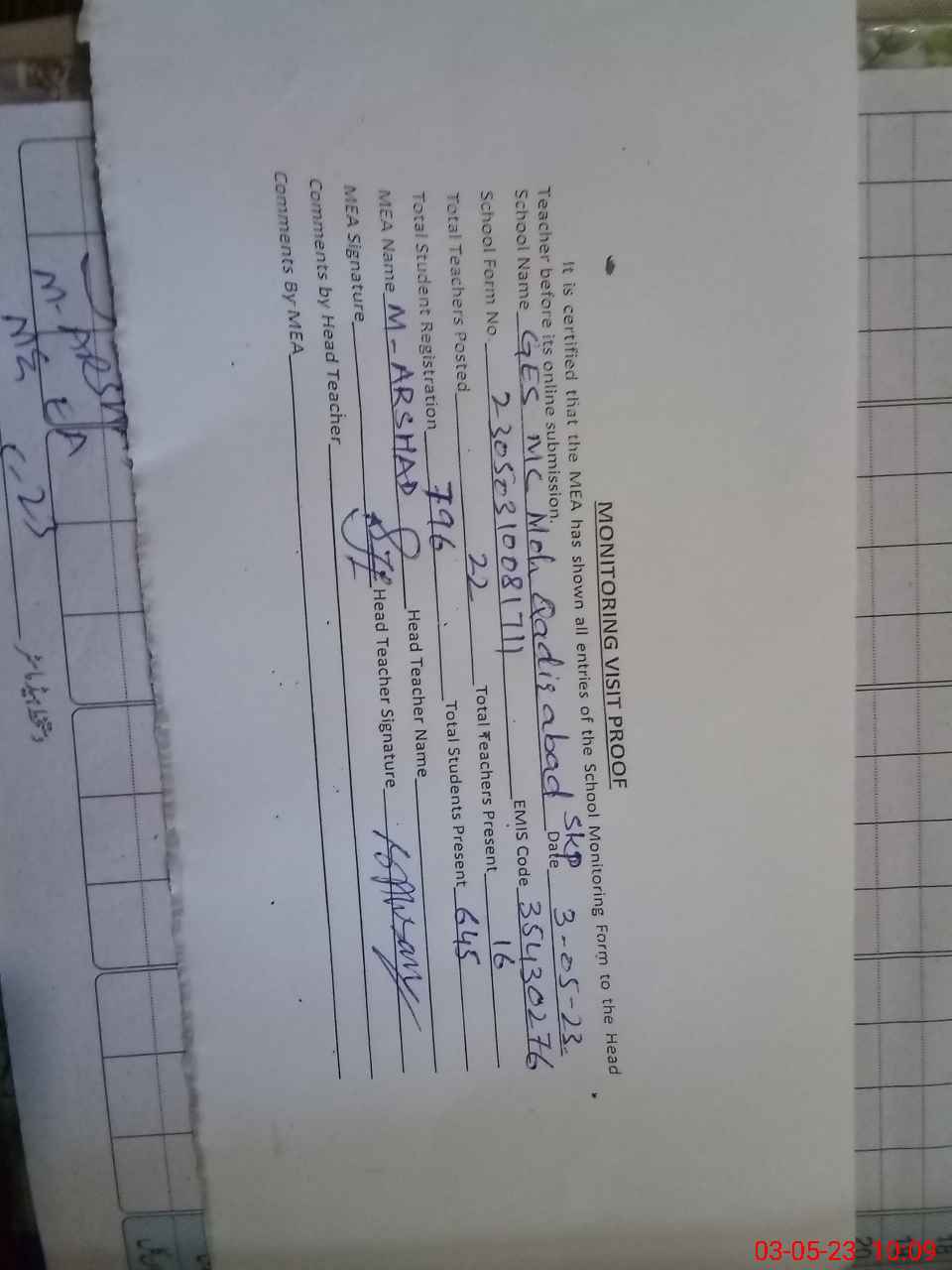 | Attendance Register | Head Teacher | MEA with School | Visit Proof |
